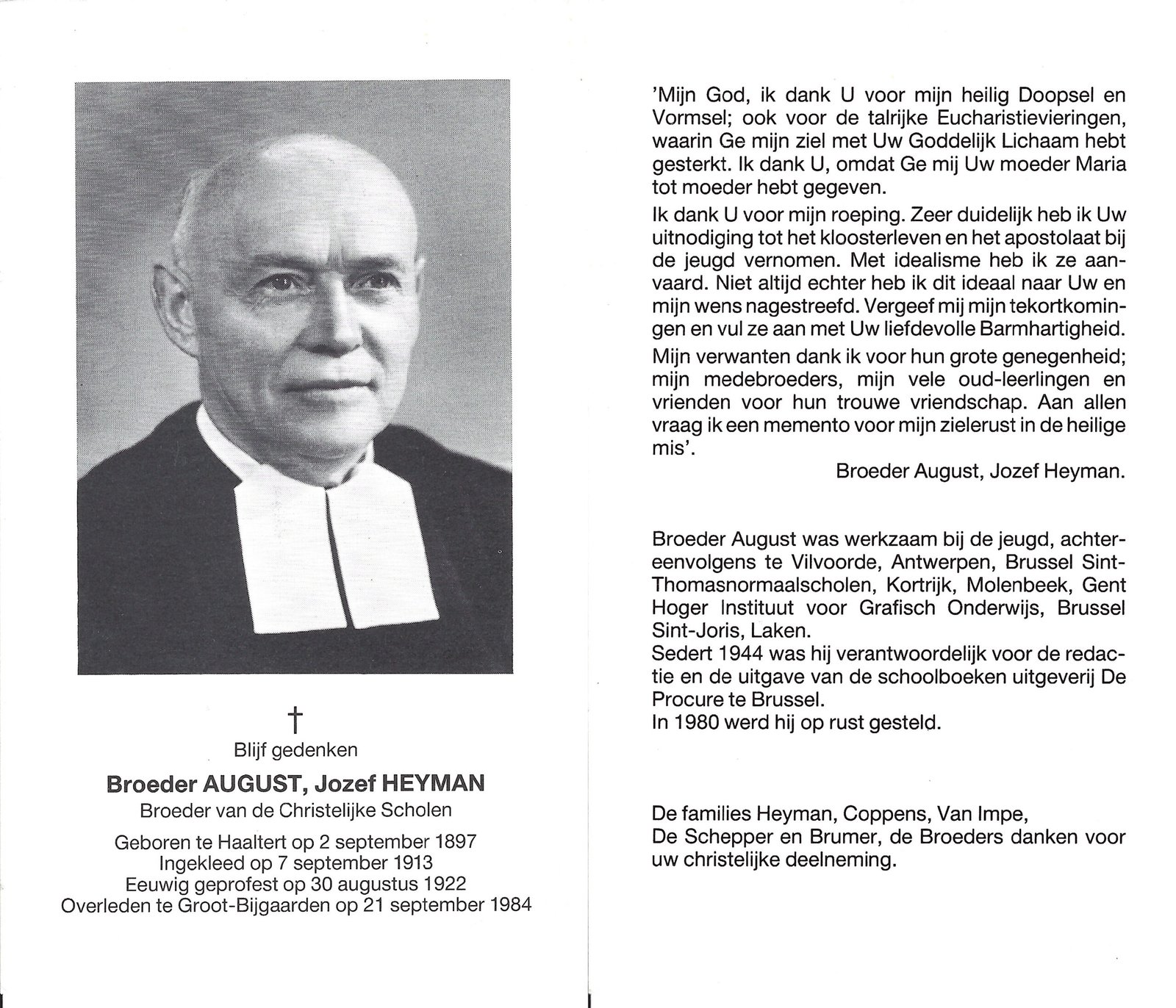 | Heyman Jozef, Broeder August | Haaltert | 02/09/1897 | Groot-Bijgaarden | 21/09/1984 |
