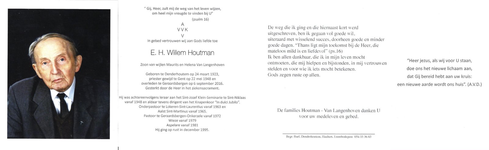 | Houtman Willem, Priester | Denderhoutem | 24/03/1923 | Geraardsbergen | 06/09/2016 |