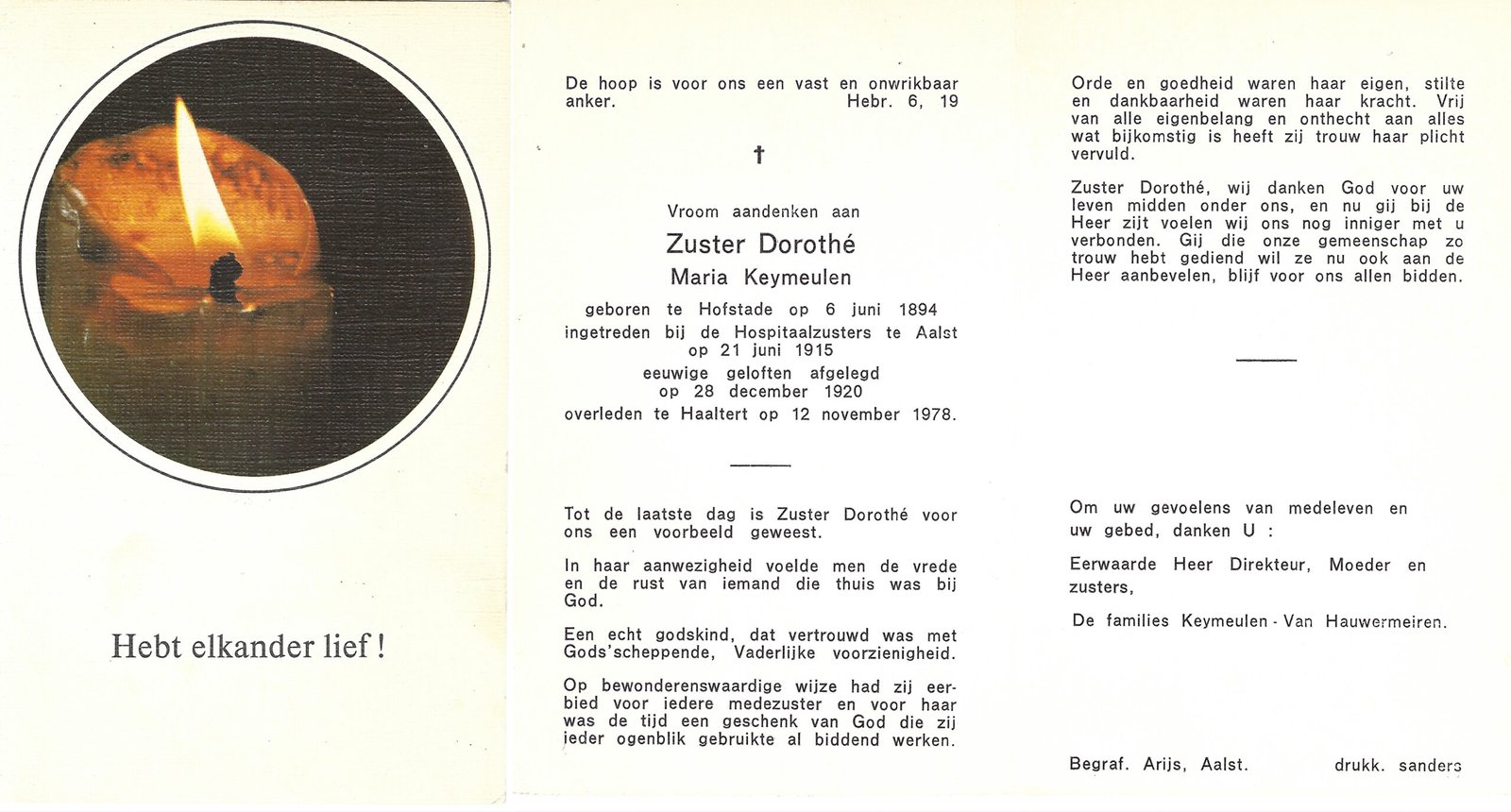 | Keymeulen Maria, Zuster Dorothé | Hofstade | 06/06/1894 | Haaltert | 12/11/1978 |