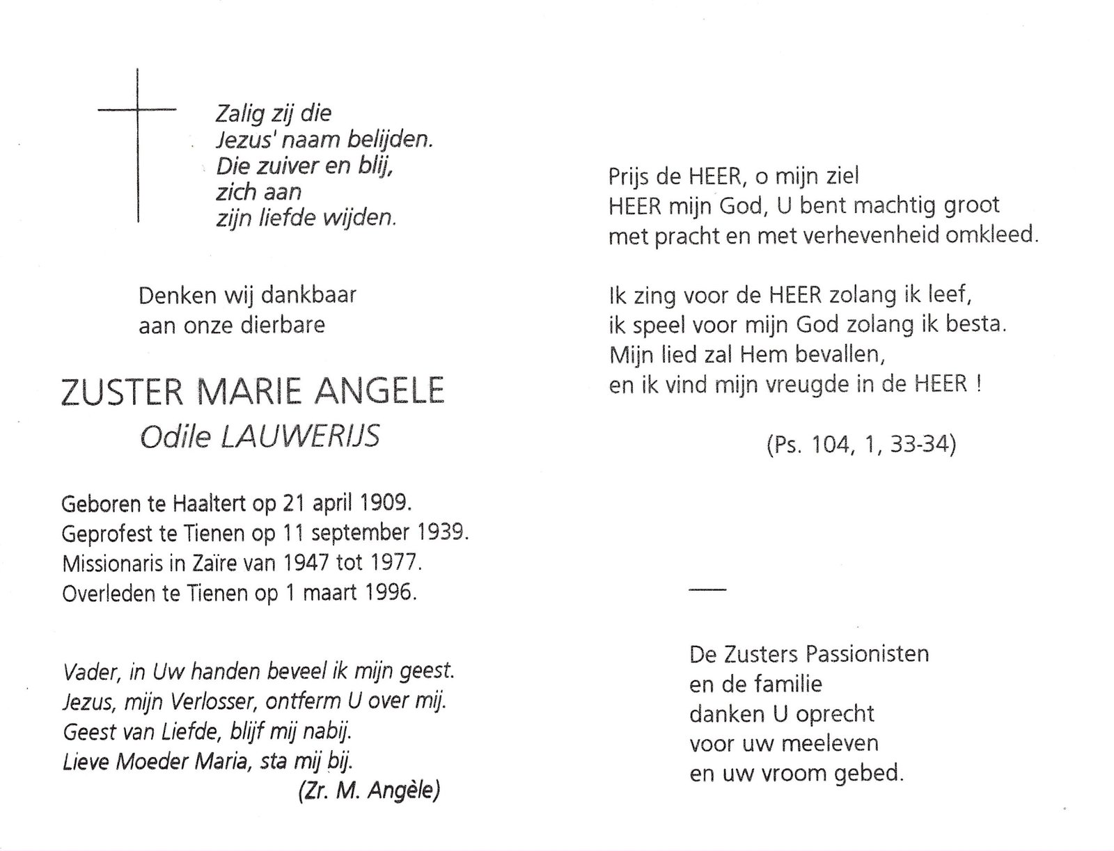 | Lauwerijs Odile, Zuster missionaris Marie Angèle | Haaltert | 21/04/1909 | Tienen | 011/03/1996 |