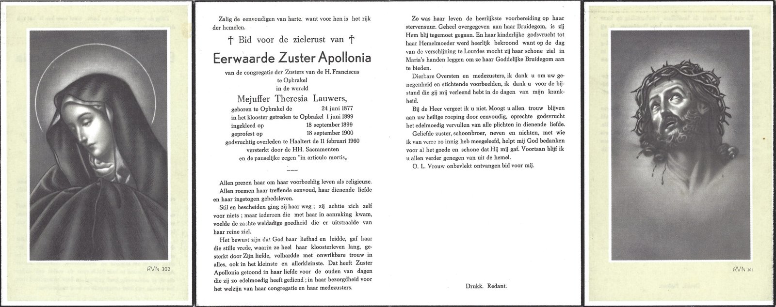 | Lauwers Thérèsia, Zuster Apollonia | Opbrakel | 24/06/1877 | Haaltert | 11/02/1960 |