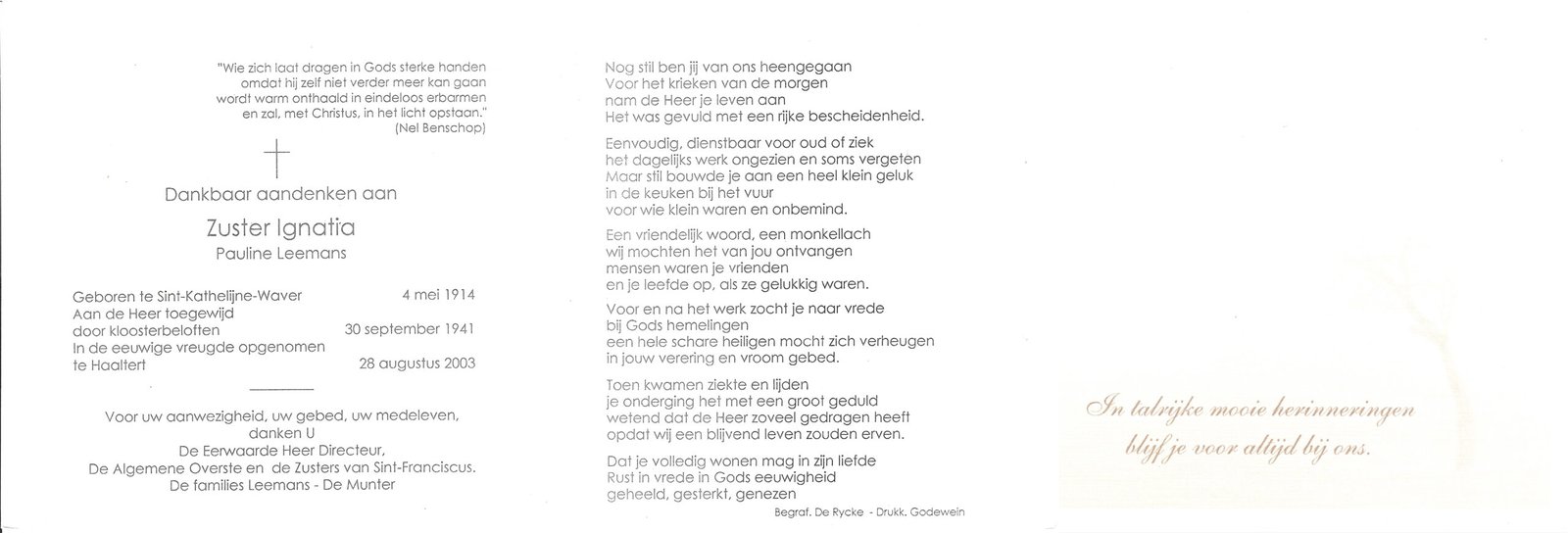 | Leemans Pauline, Zuster Ignatia | Sint-Kathelijne-Waver | 04/05/1915 | Haaltert | 28/08/2003 |