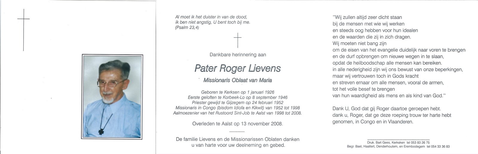 | Lievens Roger, Pater | Kerksken | 01/01/1926 | Aalst | 13/11/2008 |