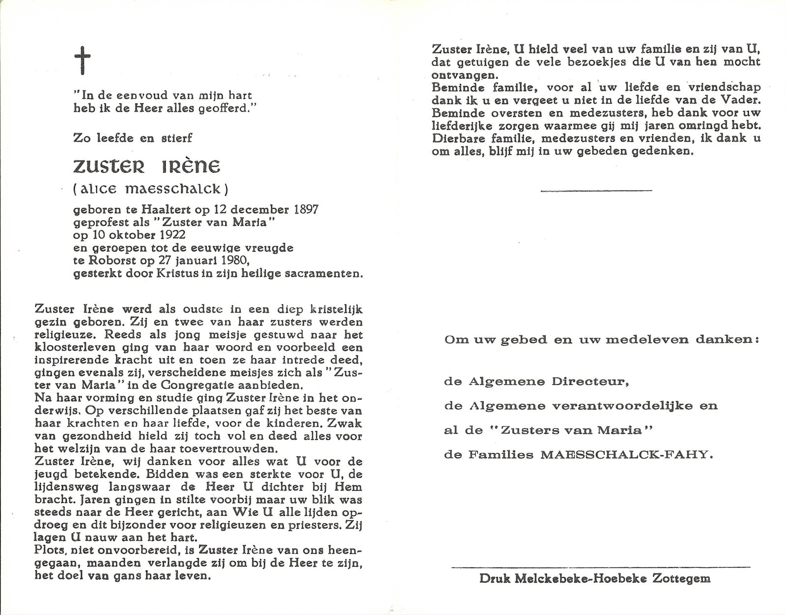 | Maesschalck Alice, Zuster Irène | Haaltert | 12/12/1897 | Roborst | 27/01/1980 |