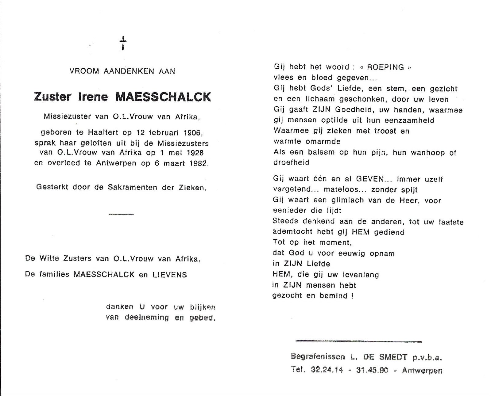 | Maesschalck Irène, Zuster missionaris Irène | Haaltert | 12/02/1906 | Antwerpen | 06/03/1982 |