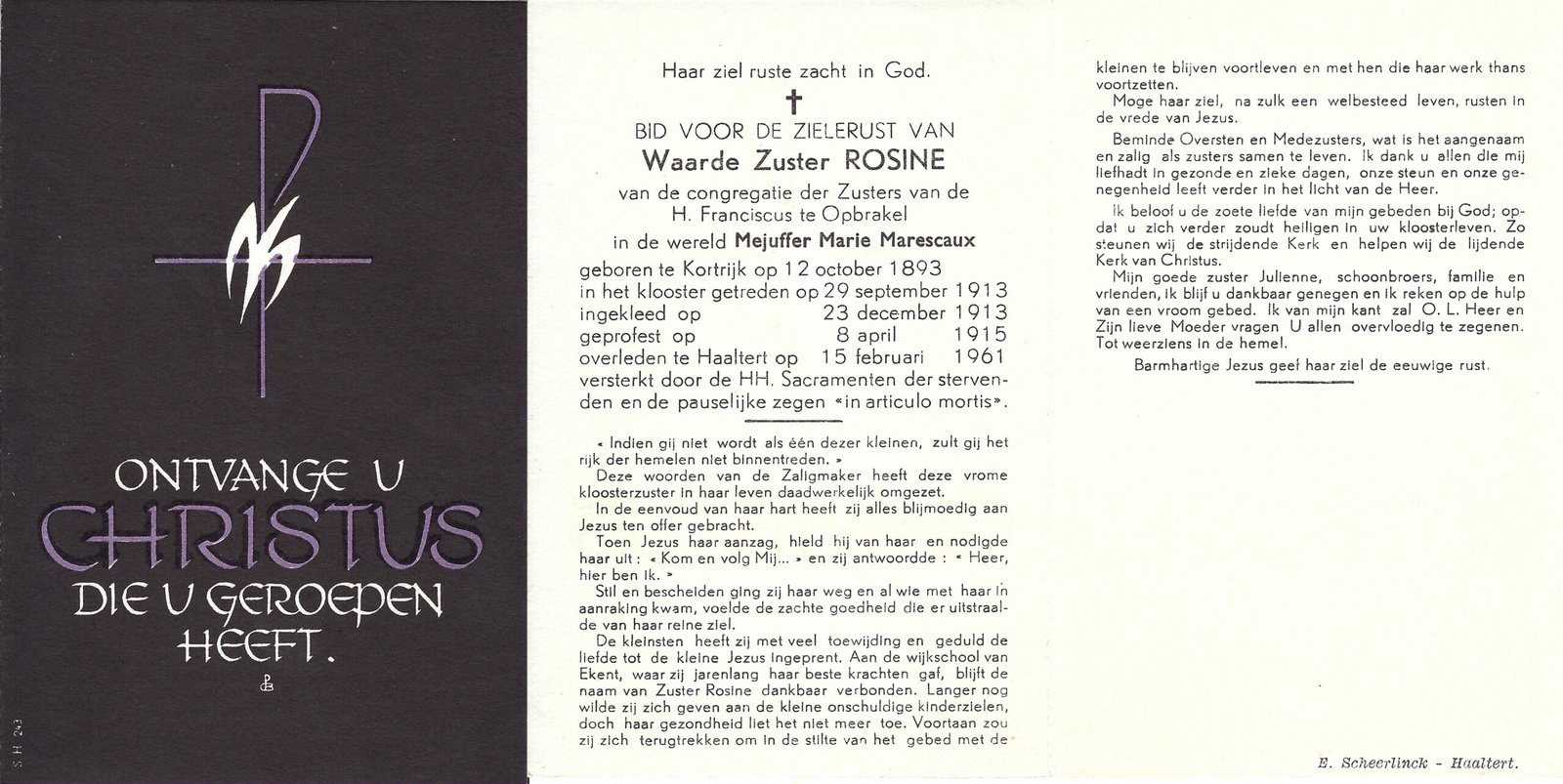 | Marescaux Marie, Zuster Rosine | Kortrijk | 12/10/1893 | Haaltert | 15/02/1961 |