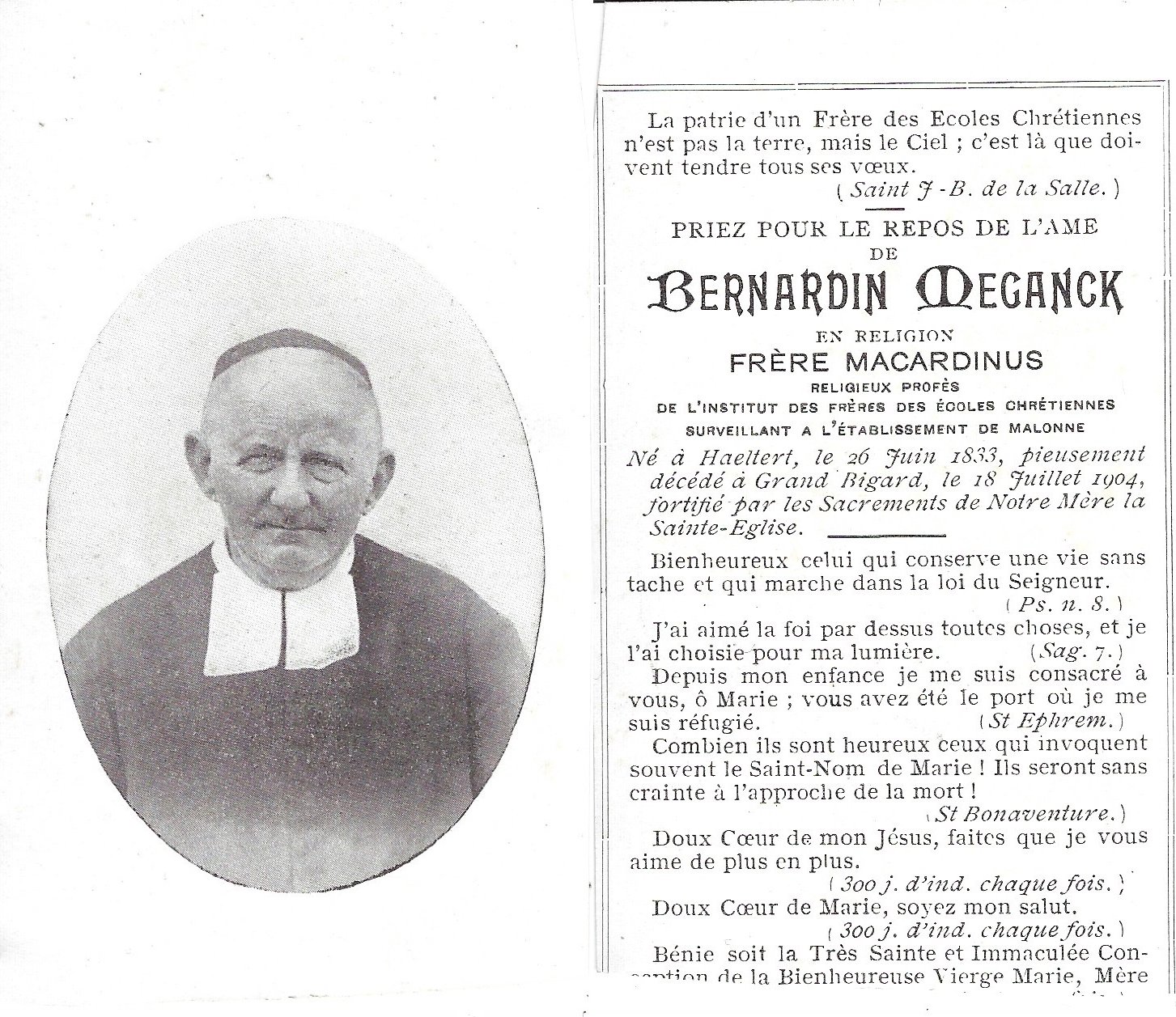 | Meganck Bernardin, Broeder Macardinus | Haaltert | 26/06/1833 | Grand Bigard | 18/07/1904 |