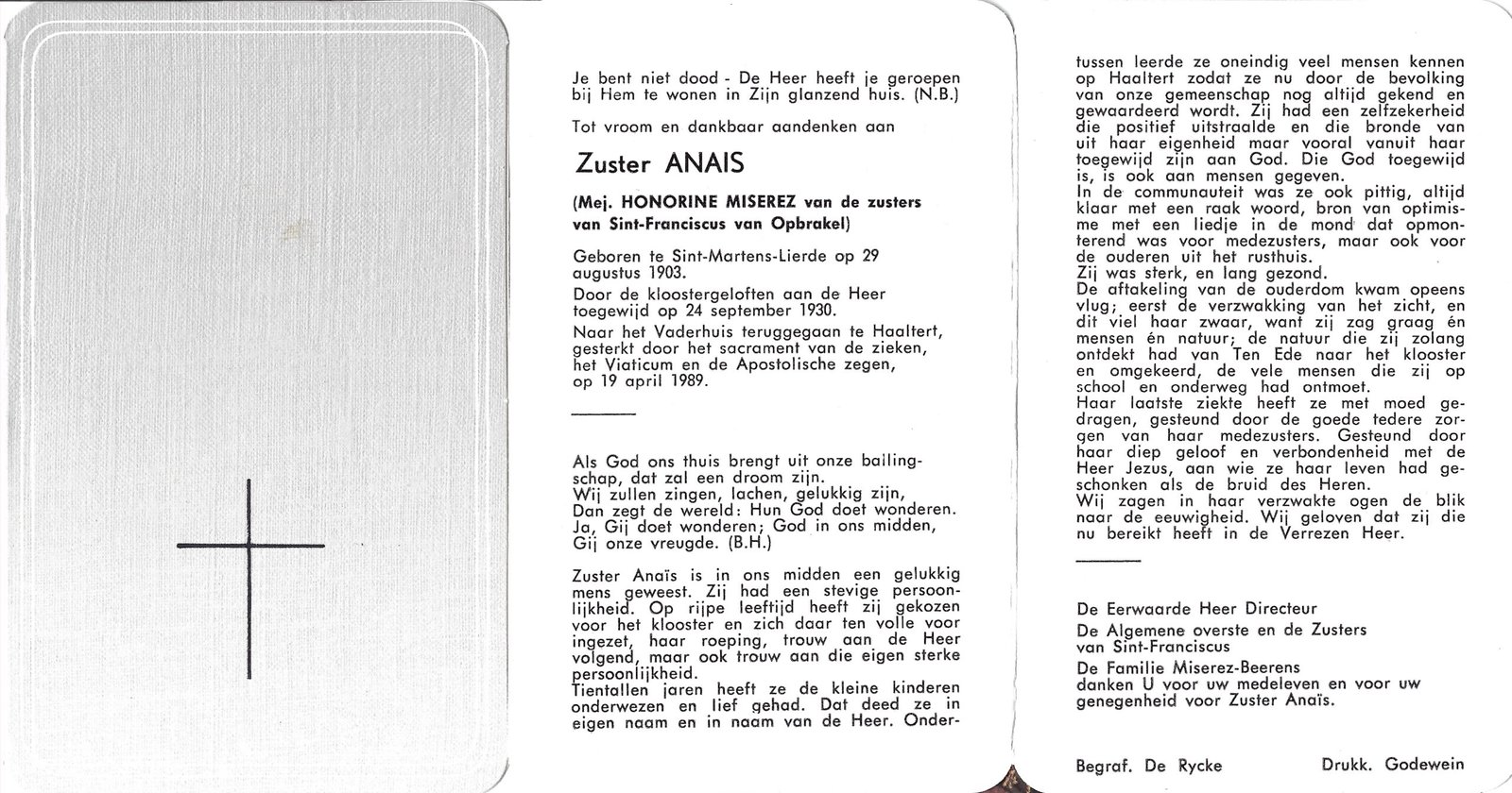 | Miserez Honorine, Zuster Anais | Sint-Martens-Lierde | 29/08/1903 | Haaltert | 19/04/1989 |