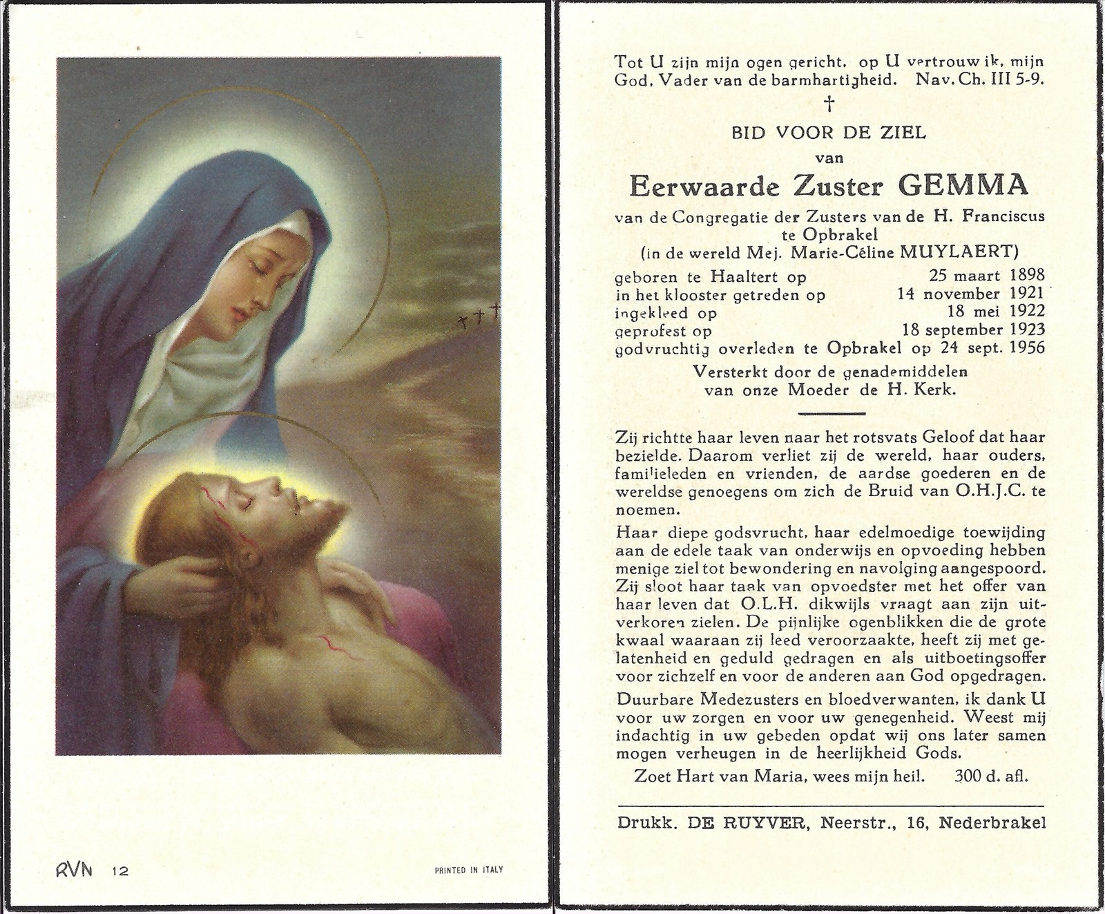| Muylaert Marie-Céline, Zuster Gemma | Haaltert | 25/03/1898 | Opbrakel | 24/09/1956 |