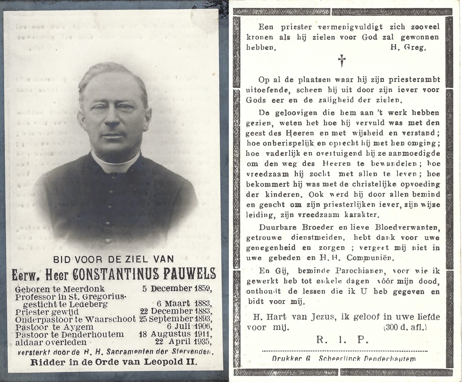 | Pauwels Constantinus, Priester Denderhoutem | Meerdonk | 05/12/1859 | Denderhoutem | 22/04/1935 |