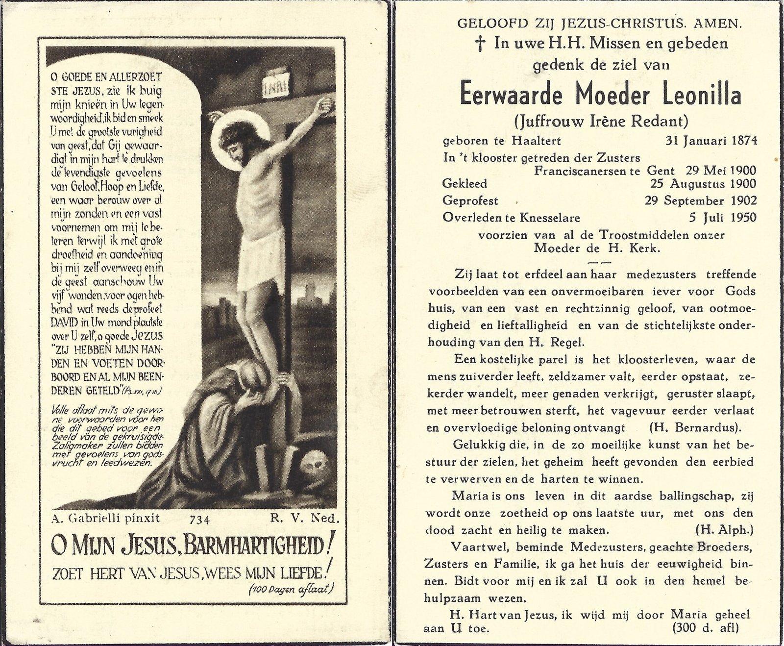 | Redant Irène, Moeder Leonilla | Haaltert | 31/01/1874 | Knesselare | 05/07/1950 |