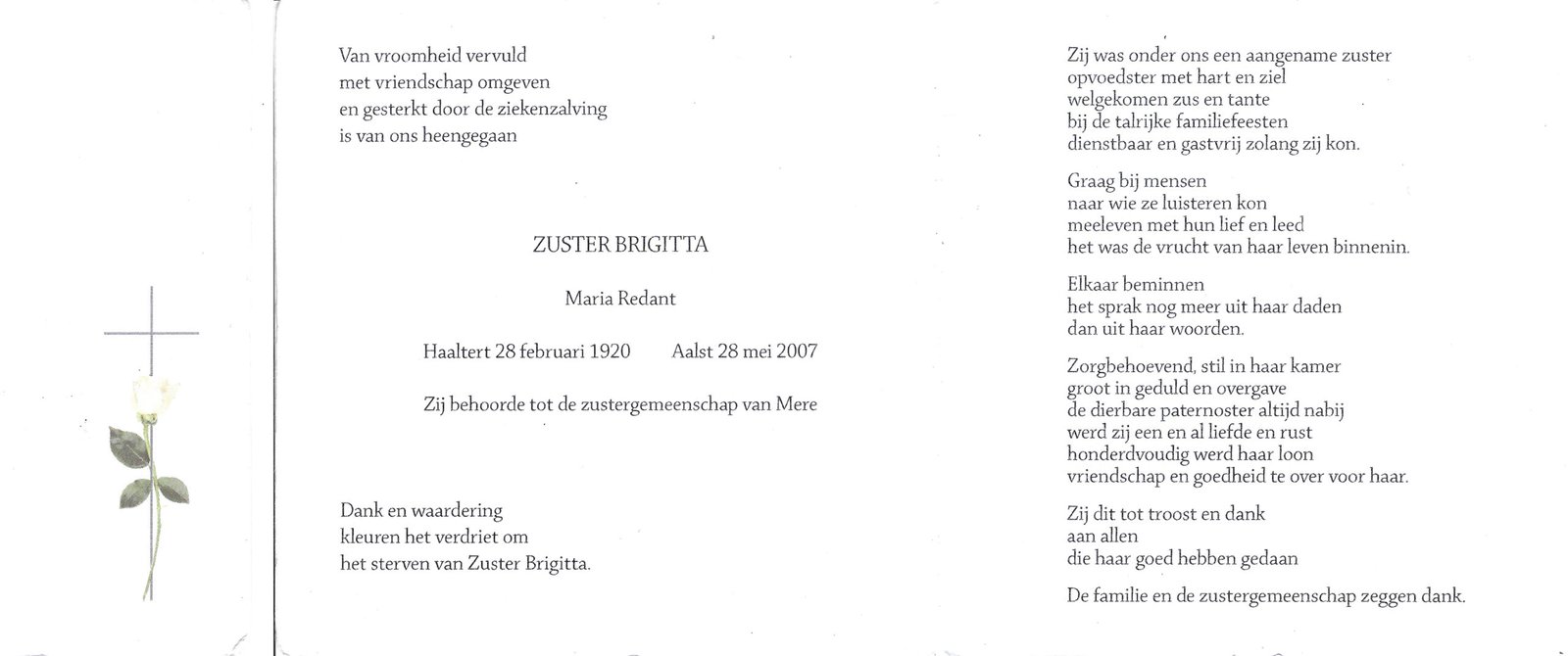 | Redant Maria, Zuster Brigitta | Haaltert | 28/02/1920 | Aalst | 28/05/2007 |