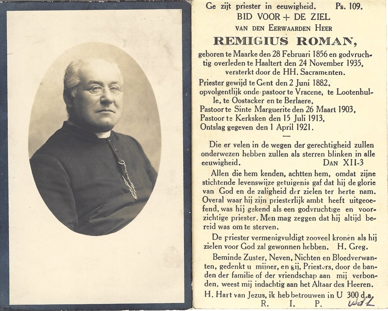 | Roman Remigius, Priester Kerksken | Maarke | 28/02/1856 | Haaltert | 24/11/1935 |