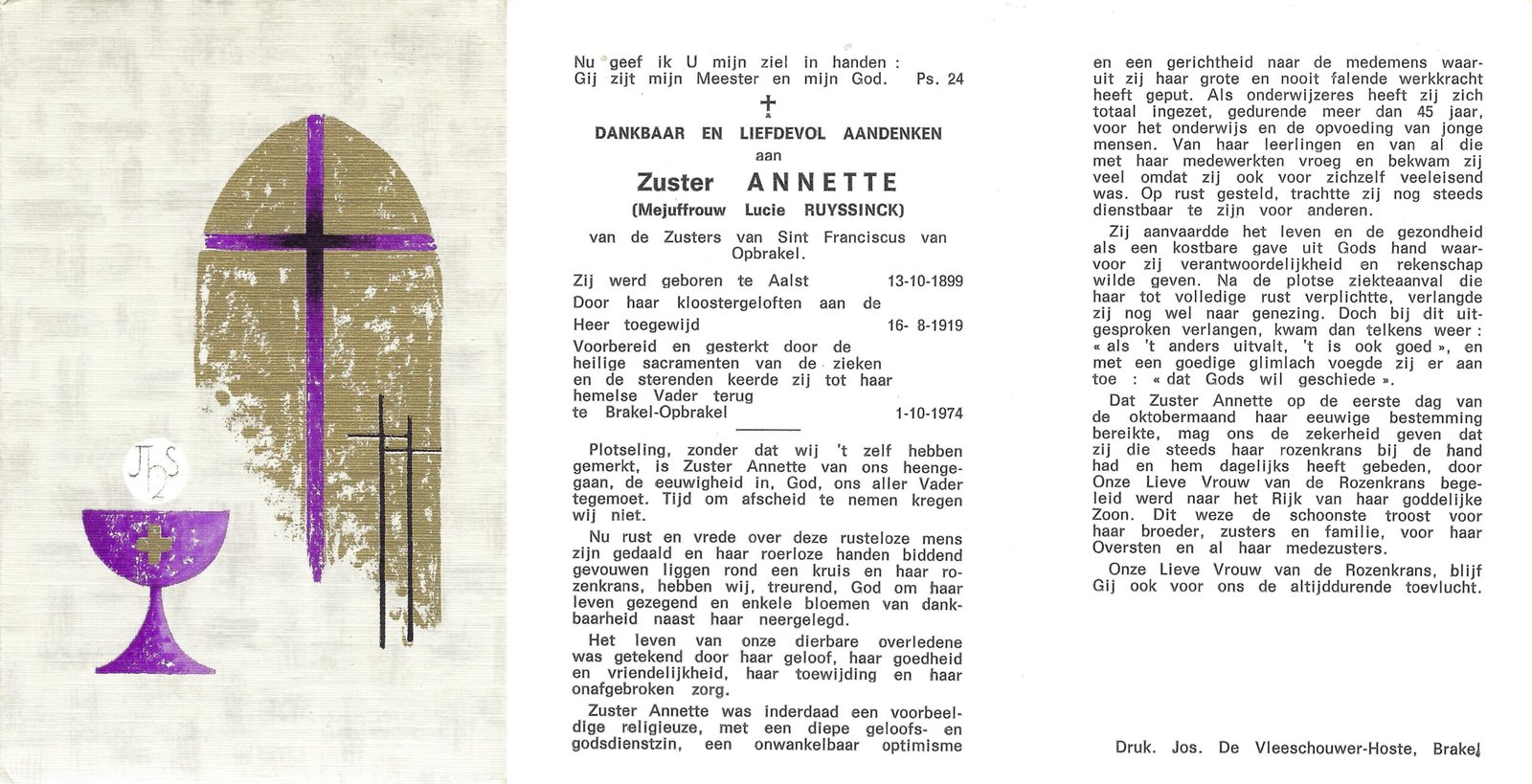 | Ruyssinck Lucie, Zuster Annette | Aalst | 13/10/1899 | Opbrakel | 01/10/1974 |