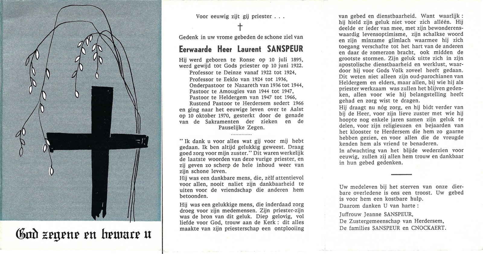 | Sanspeur Laurent, Priester Heldergem | Ronse | 10/07/1895 | Aalst | 10/10/1970 |