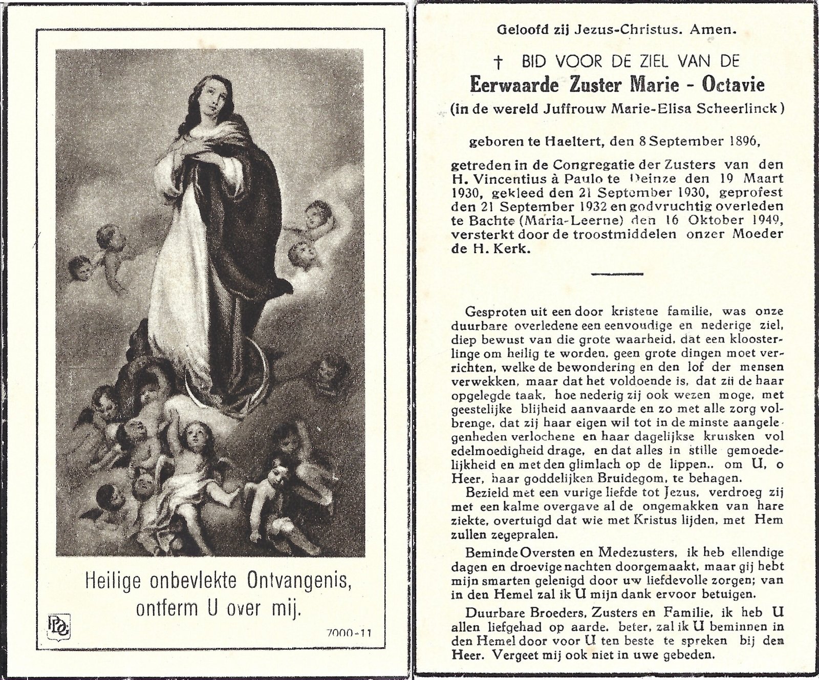 | Scheerlinck Marie-Elisa, Zuster Marie-Octavie | Haaltert | 08/09/1896 | Bachte-Maria-Leerne | 16/10/1949 |