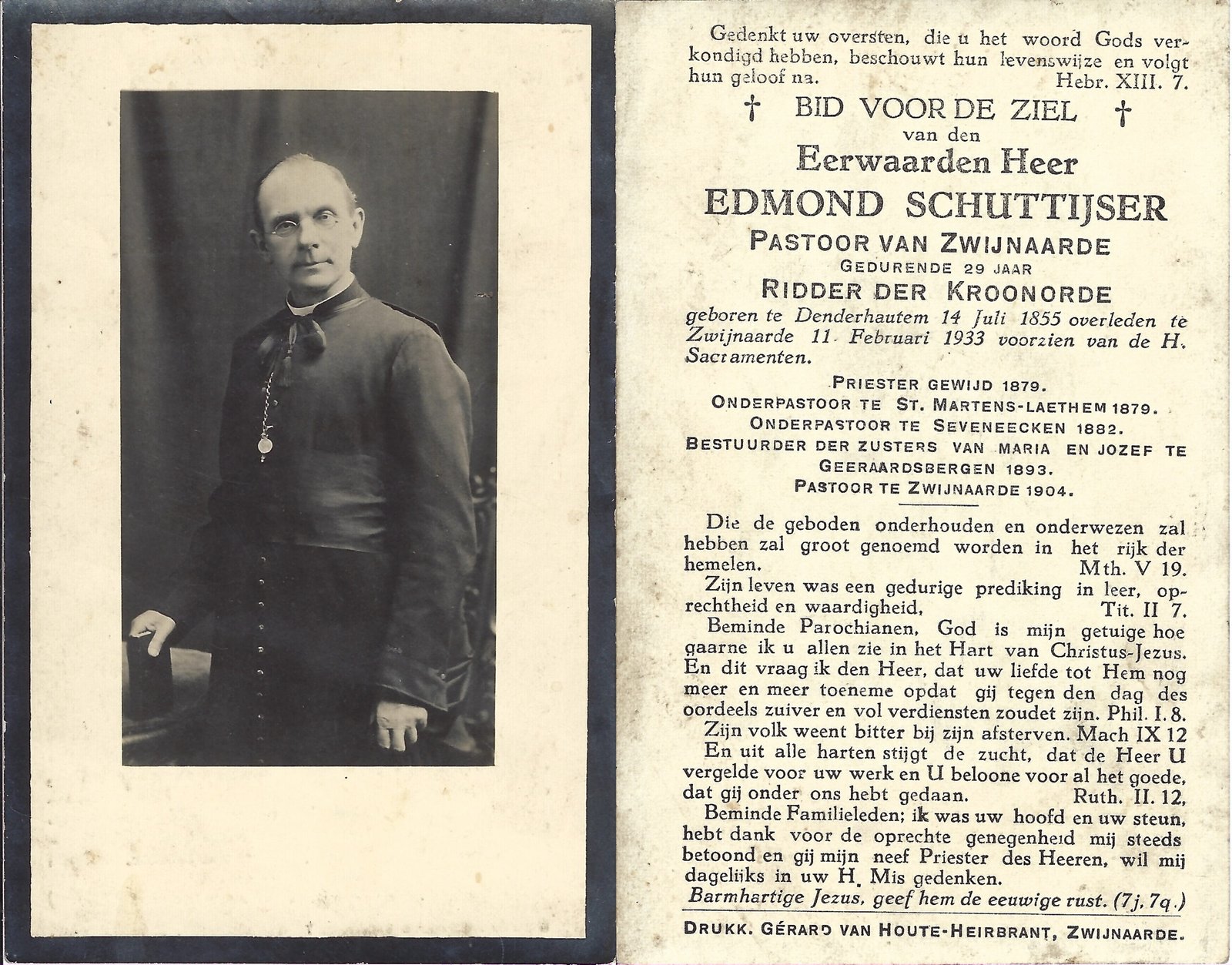 | Schuttijser Edmond, Priester | Denderhoutem | 14/07/1855 | Zwijnaarde | 11/02/1933 |