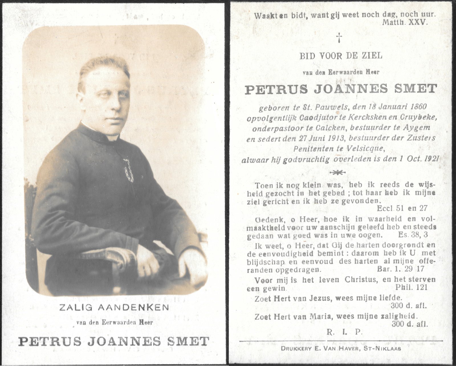 | Smet Petrus, Coadjutor Kerksken | Sint-Pauwels | 18/01/1860 | Velzeke | 01/10/1921 |