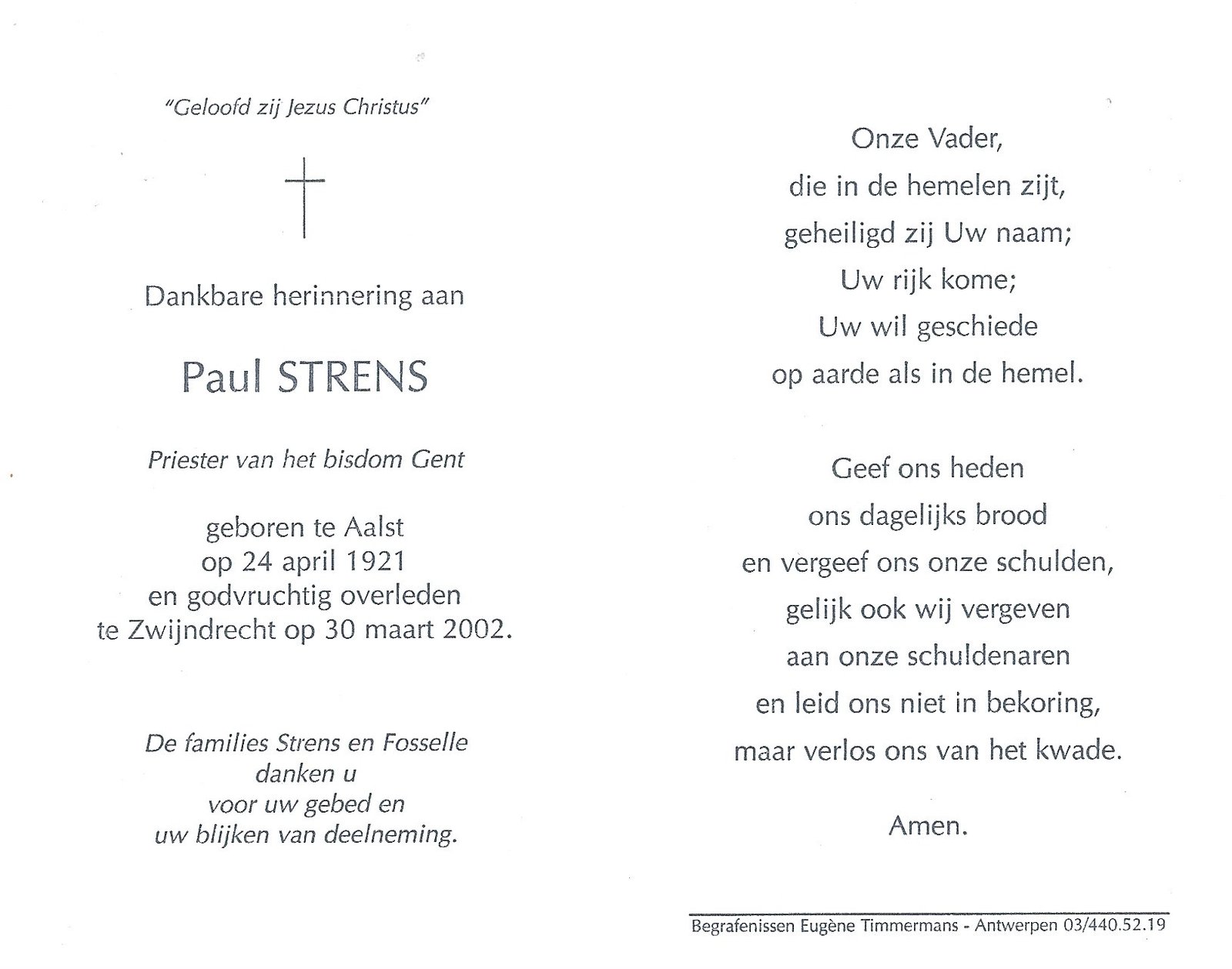 | Strens Paul, Onderpastoor Haaltert | Aalst | 24/04/1921 | Zwijndrecht | 30/03/2002 |