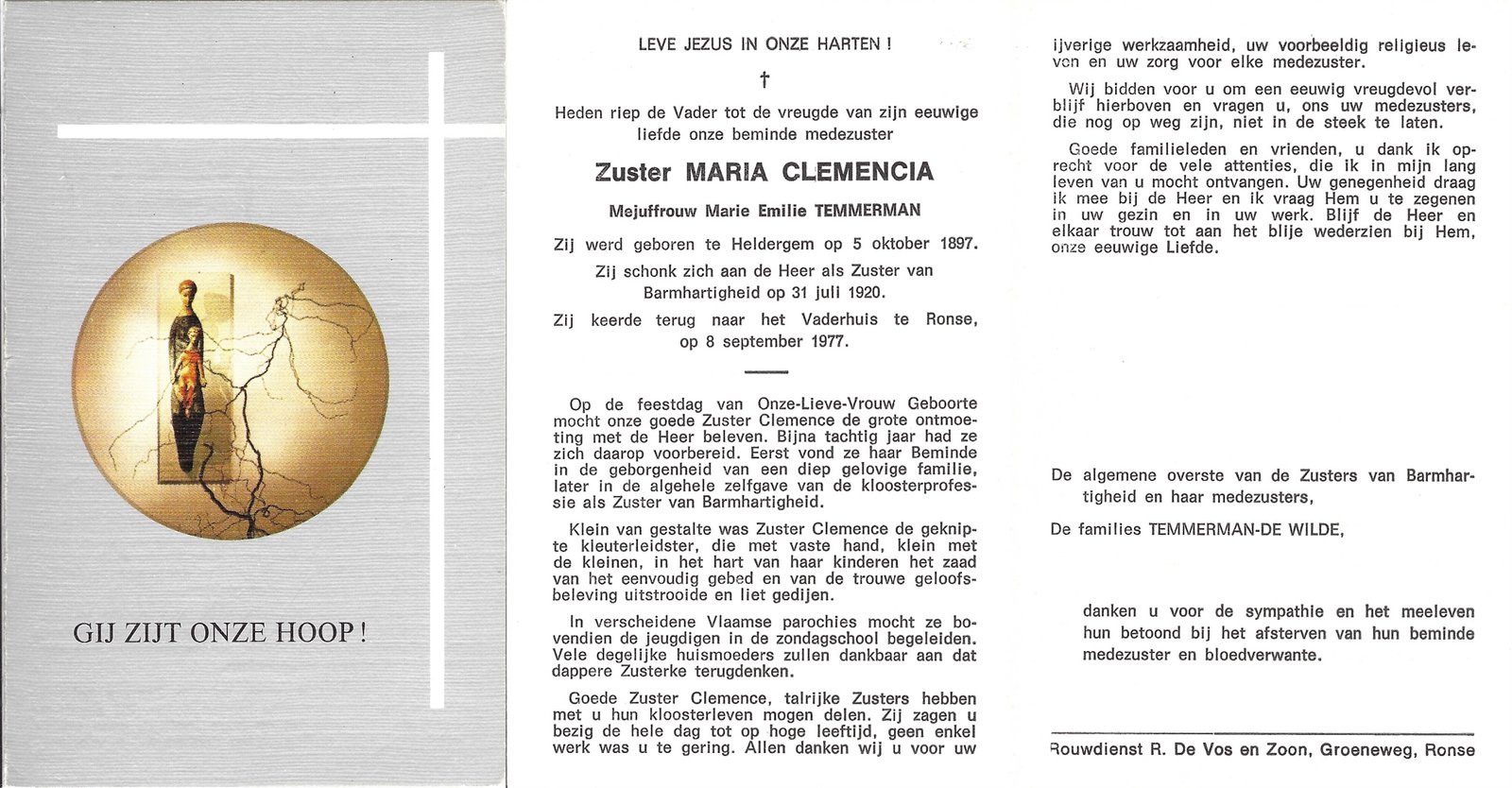 | Temmerman Marie, Zuster Maria Clemencia | Heldergem | 05/10/1897 | Ronse | 08/09/1977 |