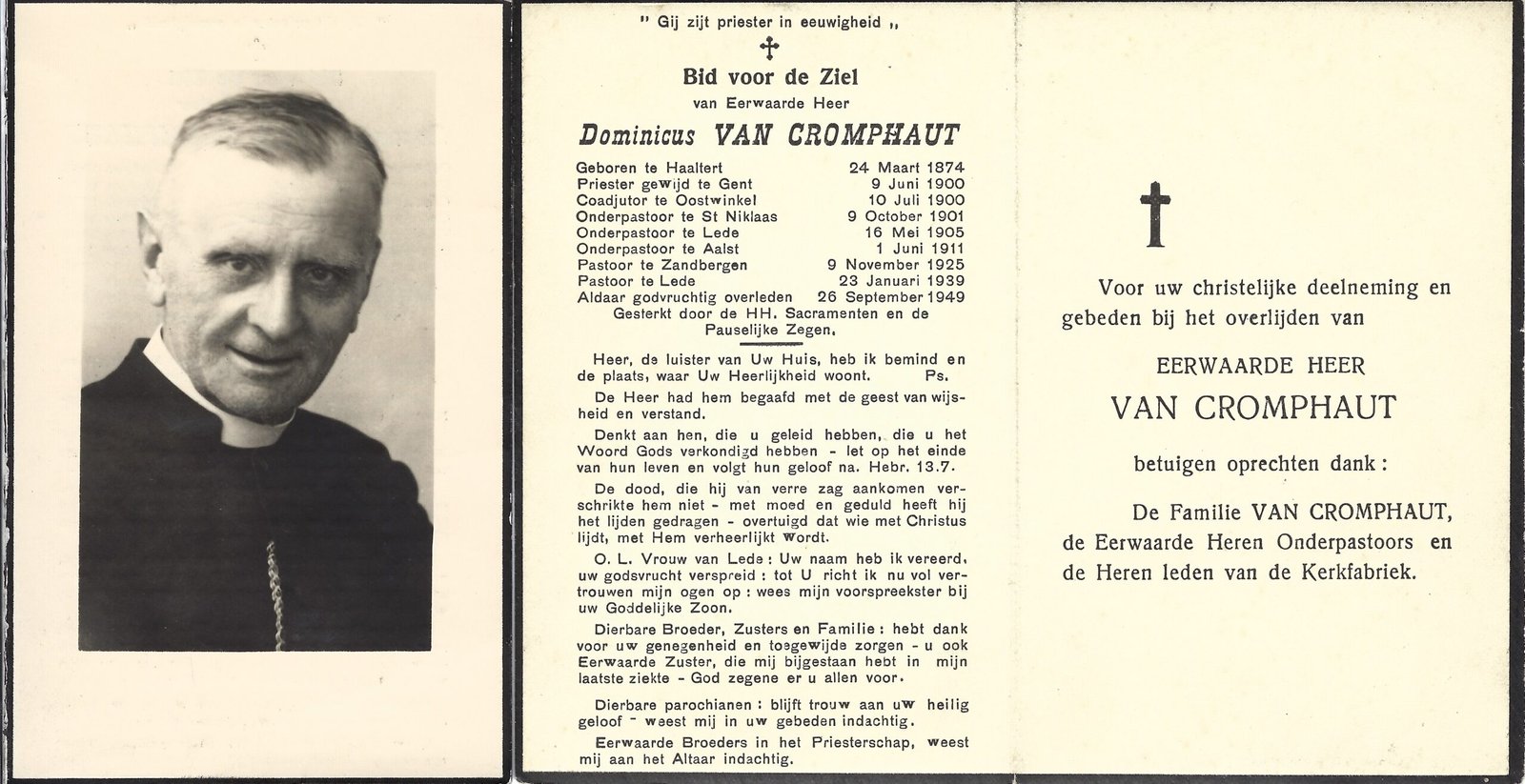| Van Cromphaut Dominicus, Priester | Haaltert | 24/03/1874 | Lede | 26/09/1949 |