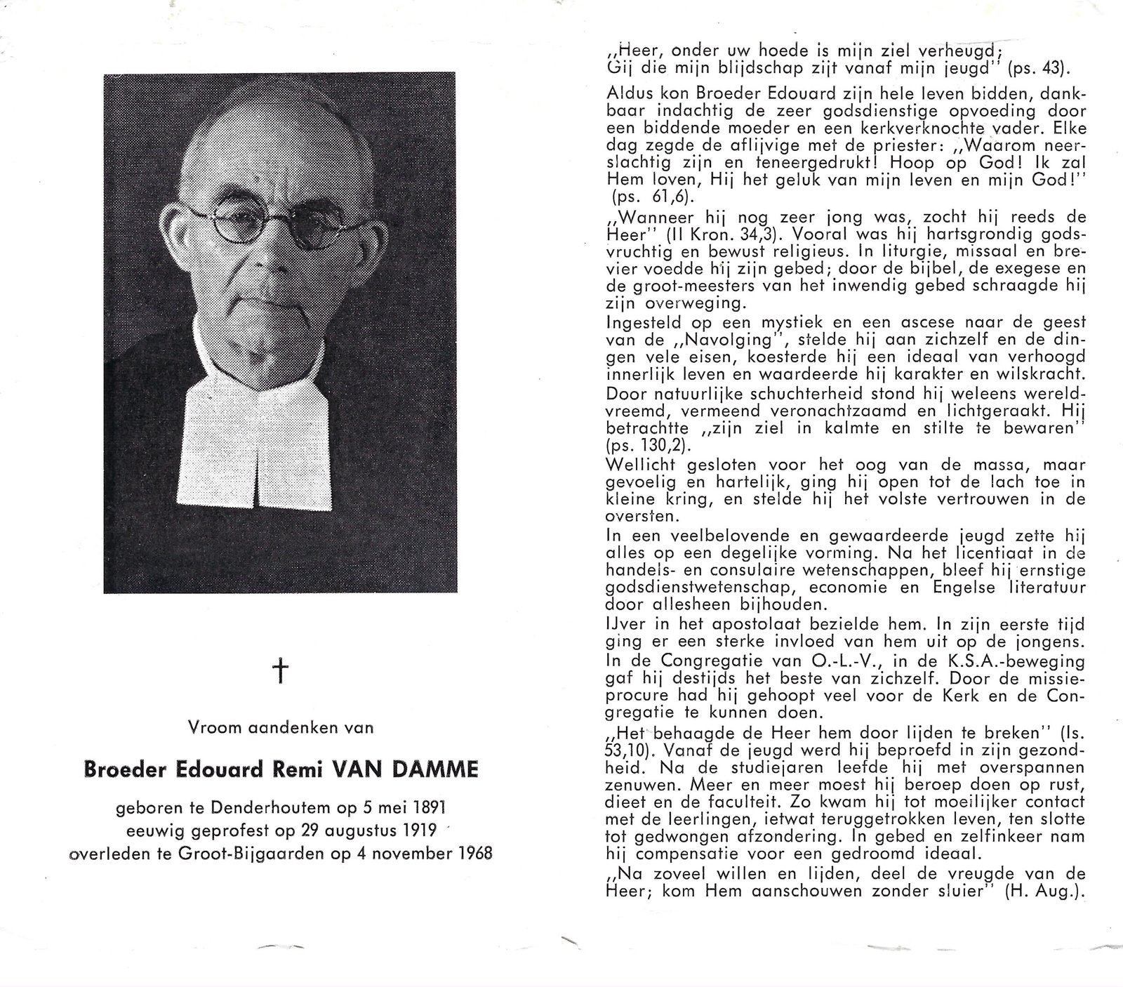 | Van Damme Remi, Broeder Edouard | Denderhoutem | 05/05/1891 | Groot-Bijgaarden | 04/11/1968 |