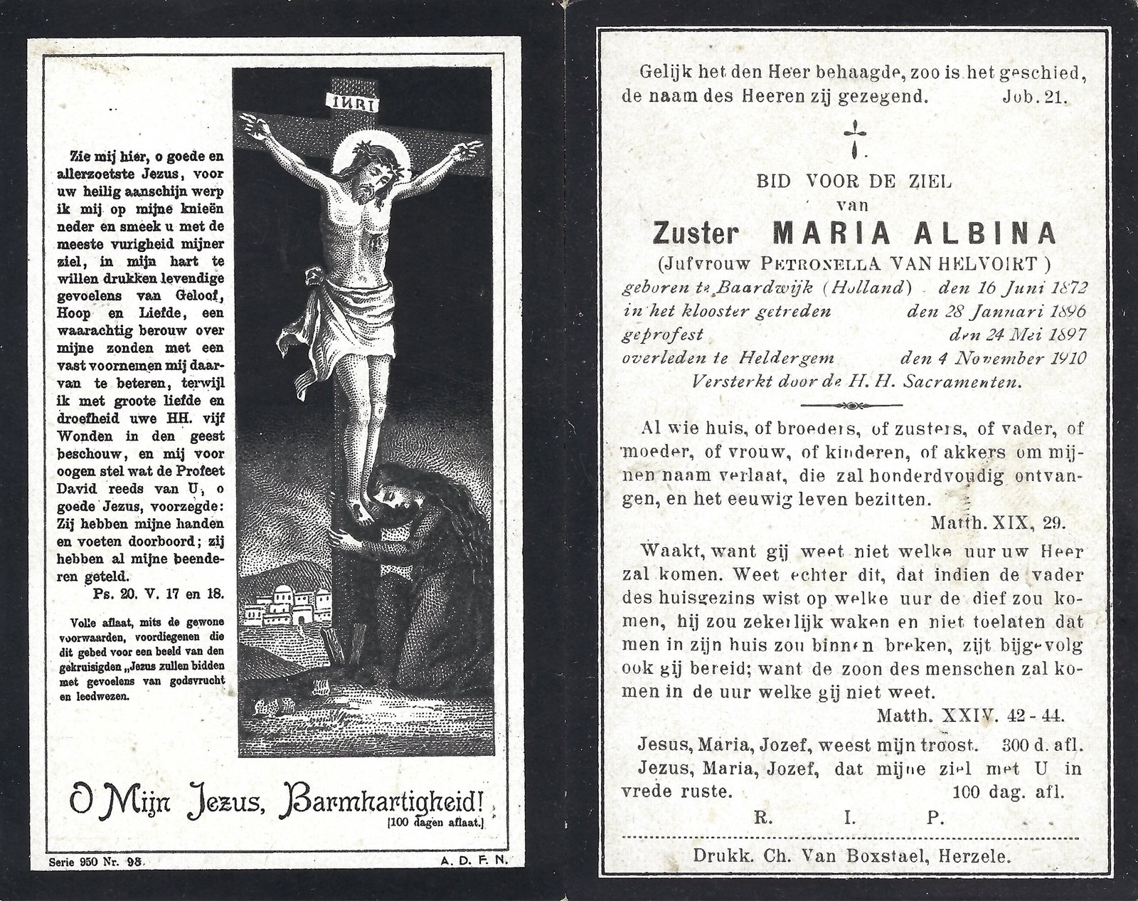 | Van Helvoirt Petronella, Zuster Maria Albina | Baardwijk (Ndl) | 16/06/1872 | Heldergem | 04/11/1910 |