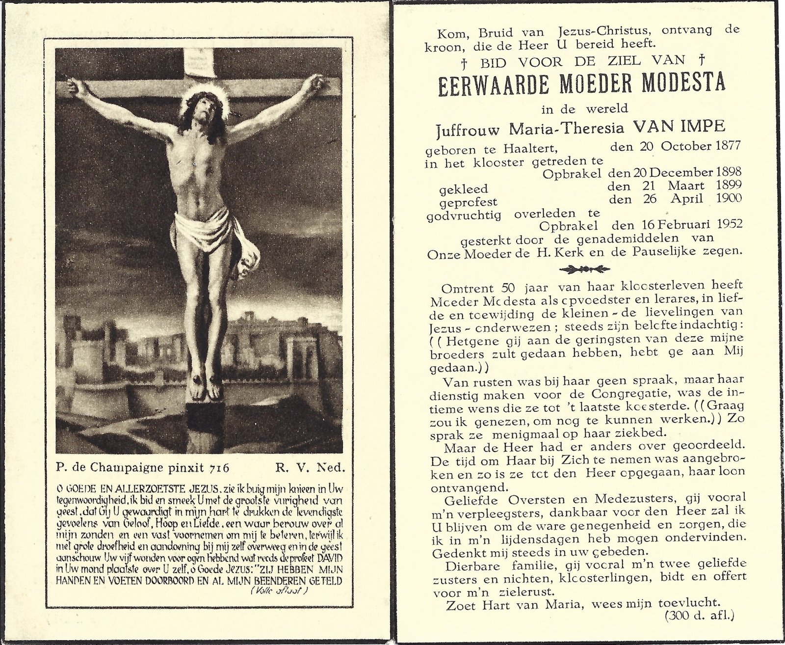 | Van Impe Maria-Thérèsia, Moeder Modesta | Haaltert | 20/10/1877 | Opbrakel | 16/02/1952 |