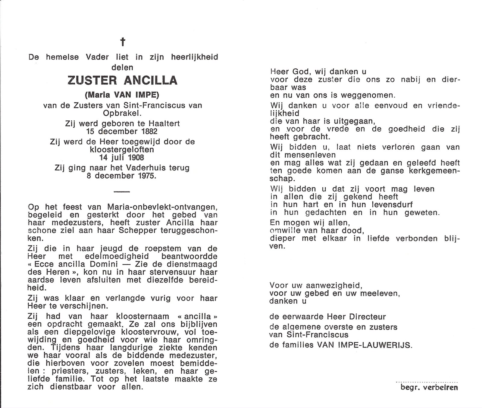 | Van Impe Maria, Zuster Ancilla | Haaltert | 15/12/1882 | Opbrakel | 08/12/1975 |