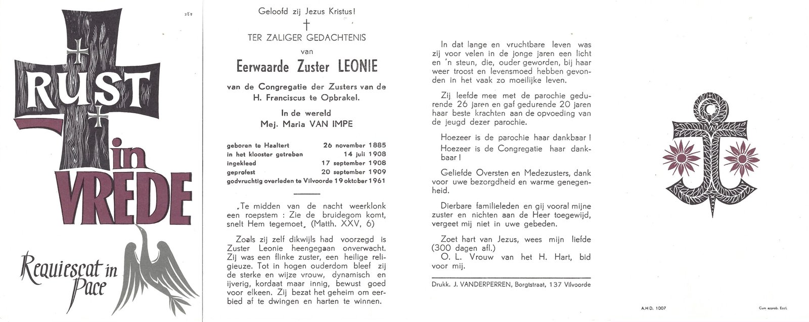 | Van Impe Maria, Zuster Leonie | Haaltert | 26/11/1885 | Vilvoorde | 19/10/1961 |