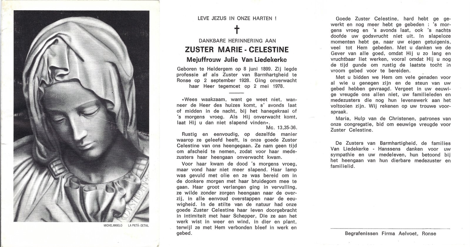| Van Liedekerke Julie, Zuster Marie-Célestine | Heldergem | 08/06/1899 | Ronse | 02/05/1978 |