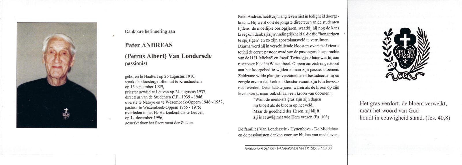 | Van Londersele Petrus, Pater passionist | Haaltert | 26/08/1910 | Leuven | 14/12/1996 |