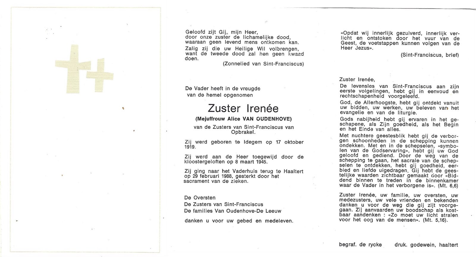 | Van Oudenhove Alice, Zuster Irenée | Idegem | 17/10/1919 | Haaltert | 29/02/1988 |