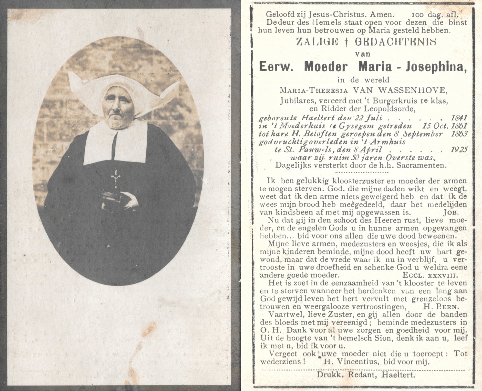 | Van Wassenhove Maria-Thérèsia,Moeder Josephina | Haaltert | 22/07/1842 | Sint-Pauwels | 08/04/1925 |