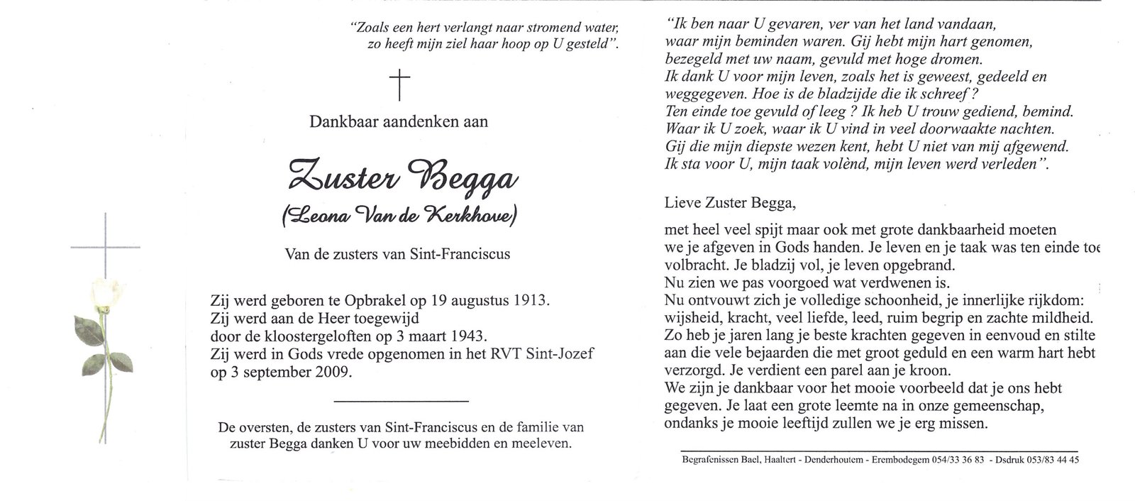 | Van de Kerkhove Leona, Zuster Begga | Ophasselt | 19/08/1913 | Haaltert | 03/09/2009 |
