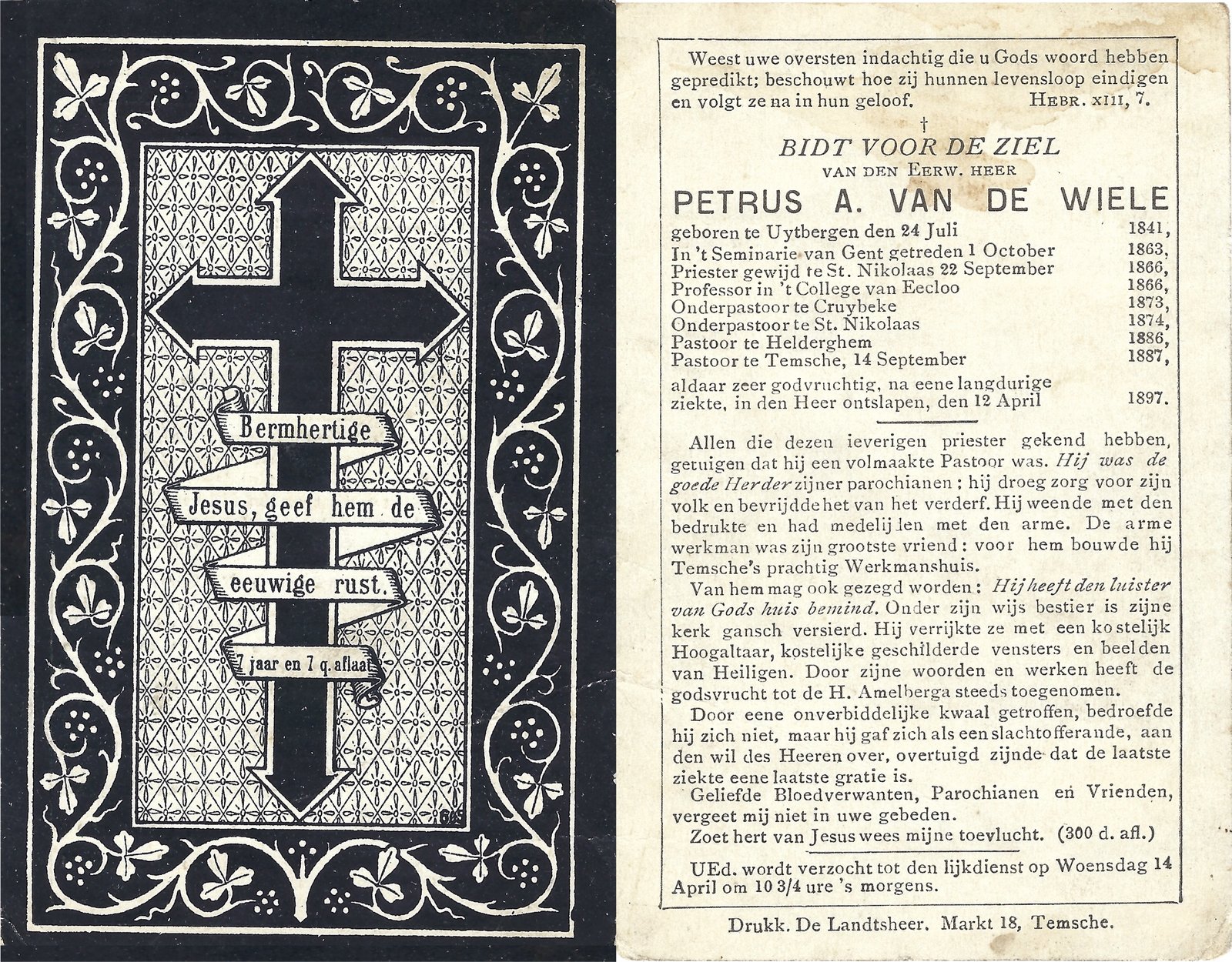| Van De Wiele Petrus, Priester Heldergem | Uitbergen | 24/07/1841 | Temse | 12/04/1897 |