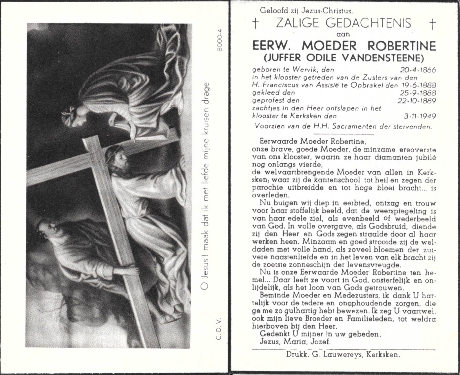 | Vandensteene Odile, Moeder Robertine | Wervik | 20/04/1866 | Kerksken | 03/11/1949 |