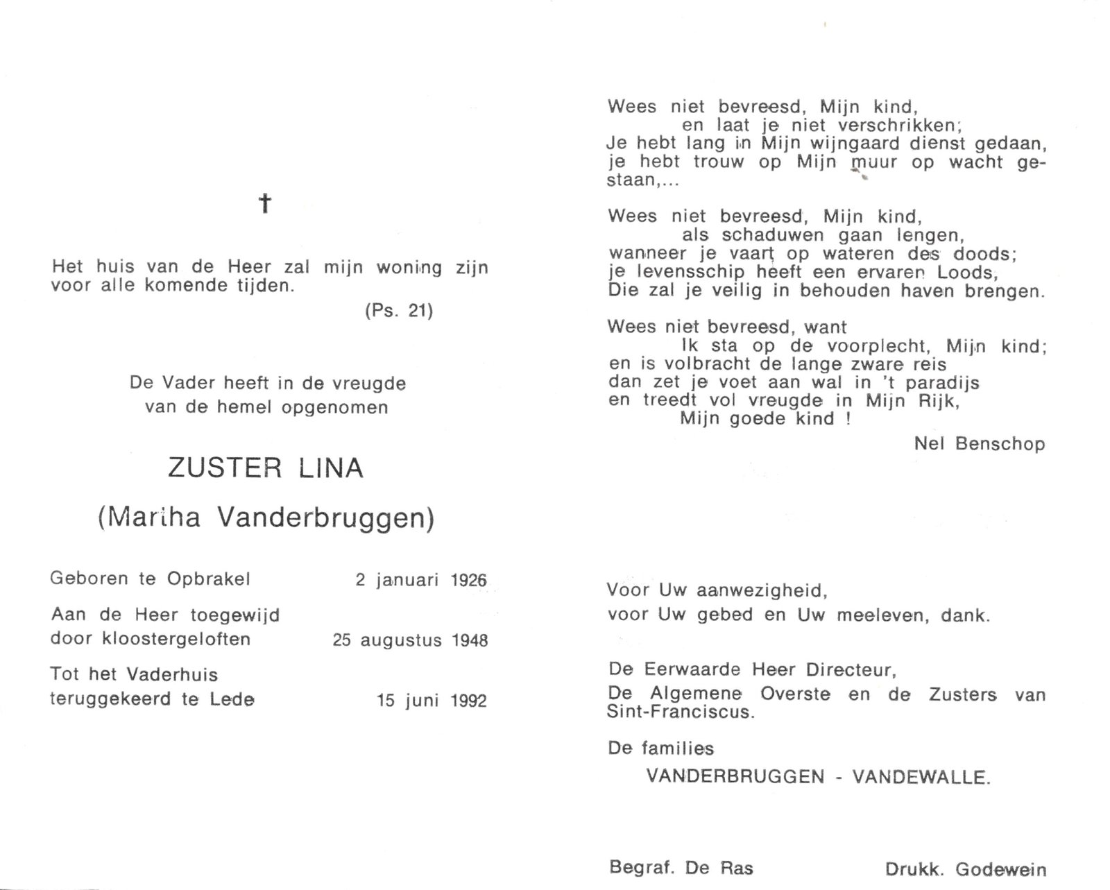 | Vanderbruggen Martha, Zuster Lina | Opbrakel | 02/01/1926 | Lede | 15/06/1992 |
