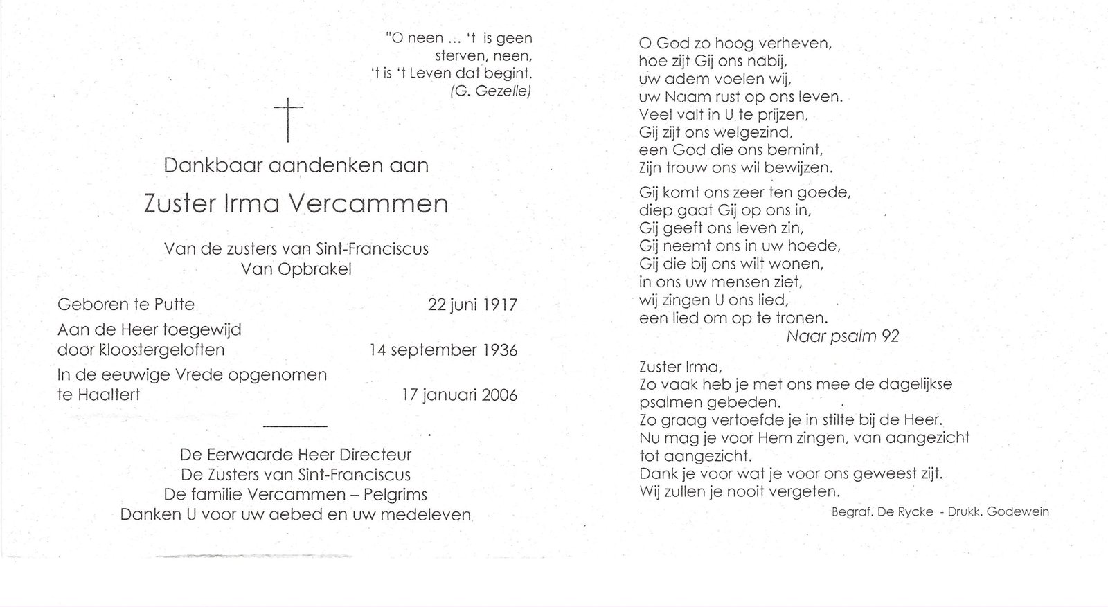 | Vercammen Irma, Zuster Irma | Putte | 22/06/1917 | Haaltert | 17/01/2006 |