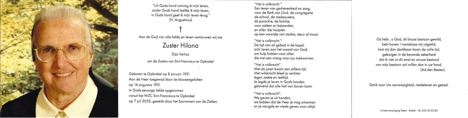 | Verloo Elza, Zuster Hilona | Opbrakel | 08/01/1931 | Opbrakel | 07/07/2025 |