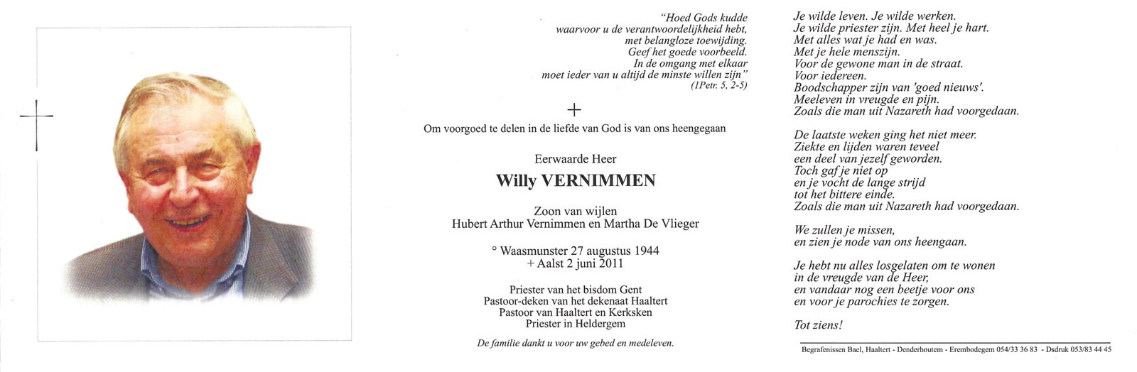 | Vernimmen Willy, Priester-Deken Haaltert | Waasmunster | 27/08/1944 | Aalst | 02/06/2011 |