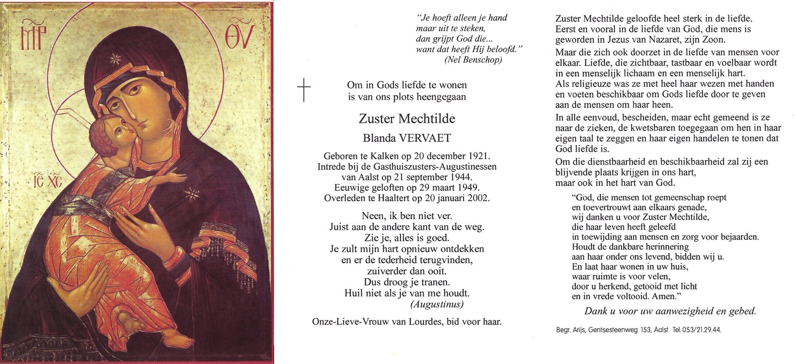 | Vervaet Blanda, Zuster Mechtilde | Kalken | 20/12/1921 | Haaltert | 20/01/2002 |