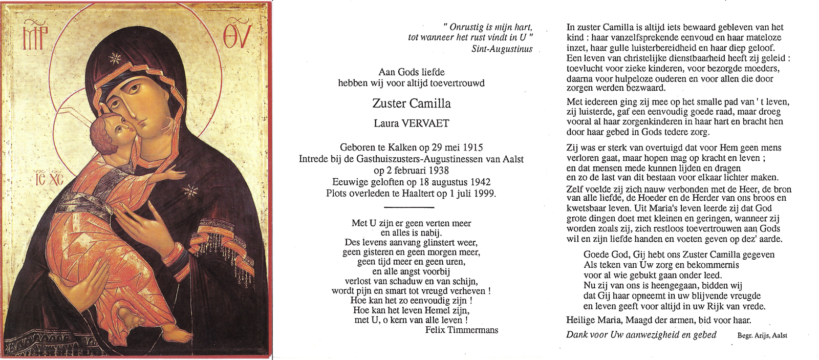 | Vervaet Laura, Zuster Camilla | Kalken | 29/05/1915 | Haaltert | 01/07/1999 |