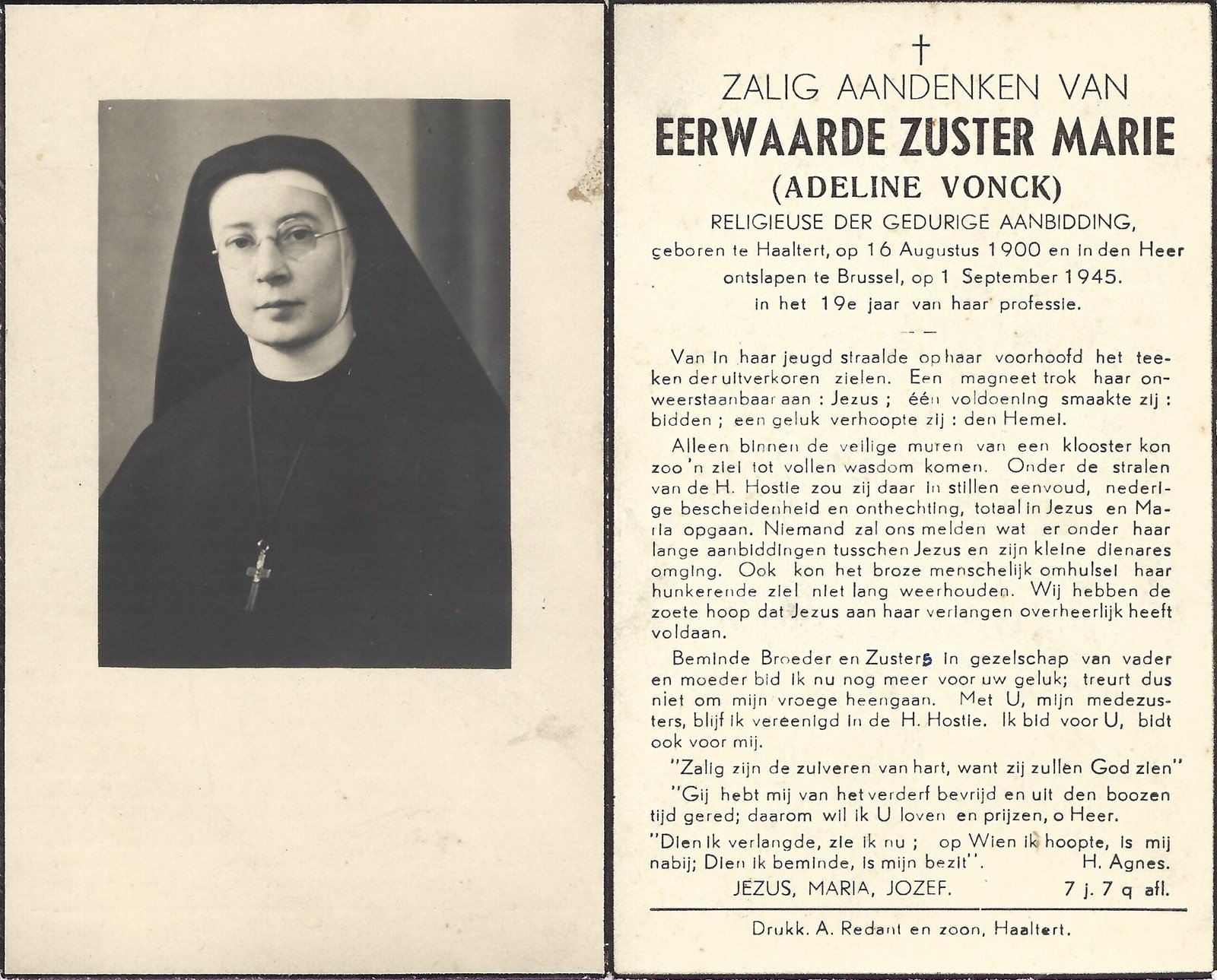 | Vonck Adeline, Zuster Marie | Haaltert | 16/08/1900 | Brussel | 01/09/1945 |