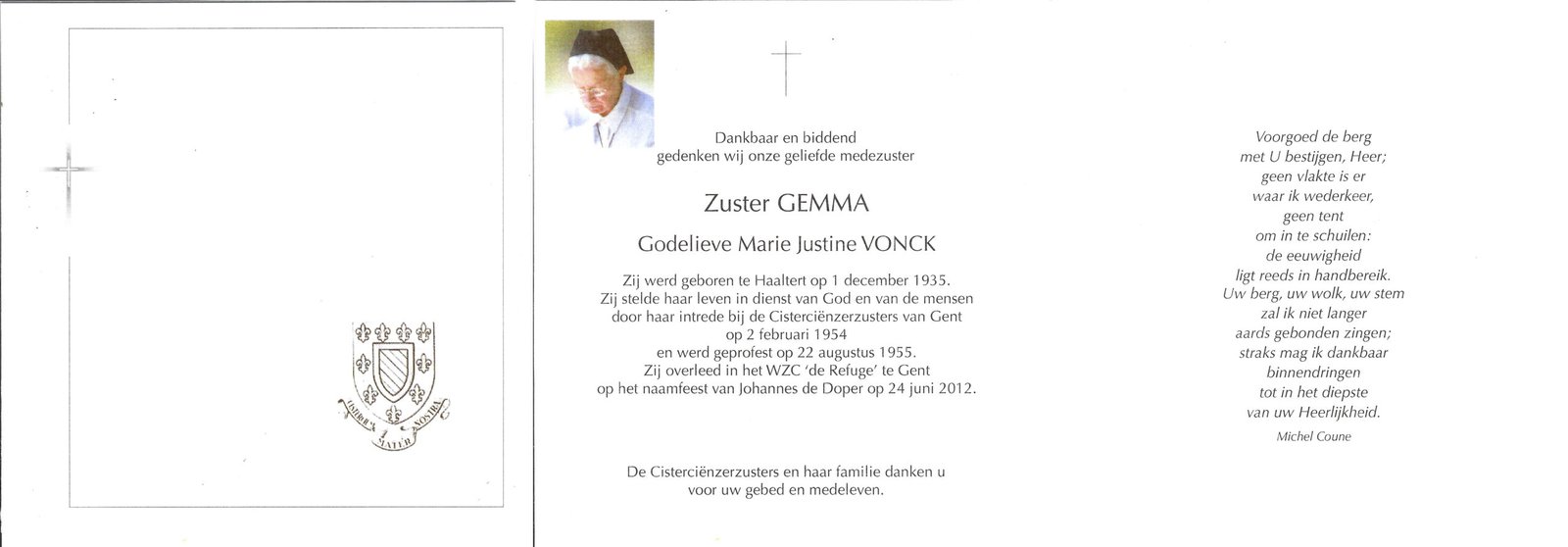 | Vonck Godelieve, Zuster Gemma | Haaltert | 01/12/1935 | Gent | 24/06/2012 |