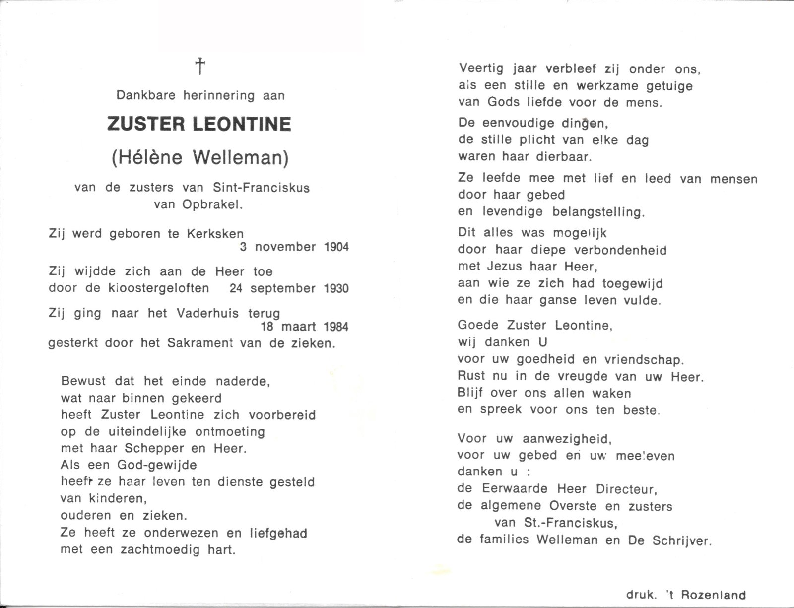| Welleman Hélène, Zuster Leontine | Kerksken | 03/11/1904 | Opbrakel | 18/03/1984 |