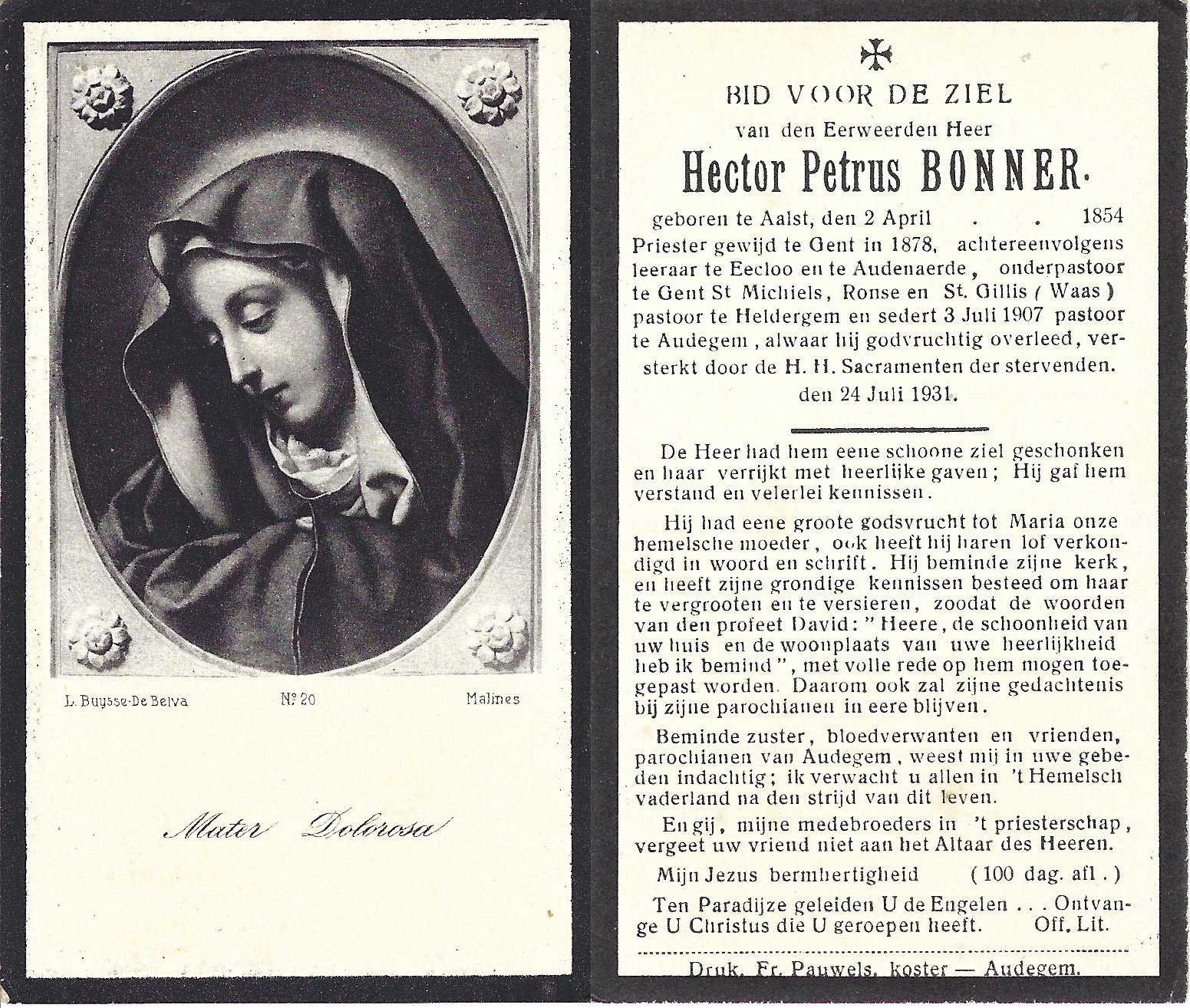 Bonner Hector, Priester HeldergemAalst02/04/1854Oudegem24/07/1931