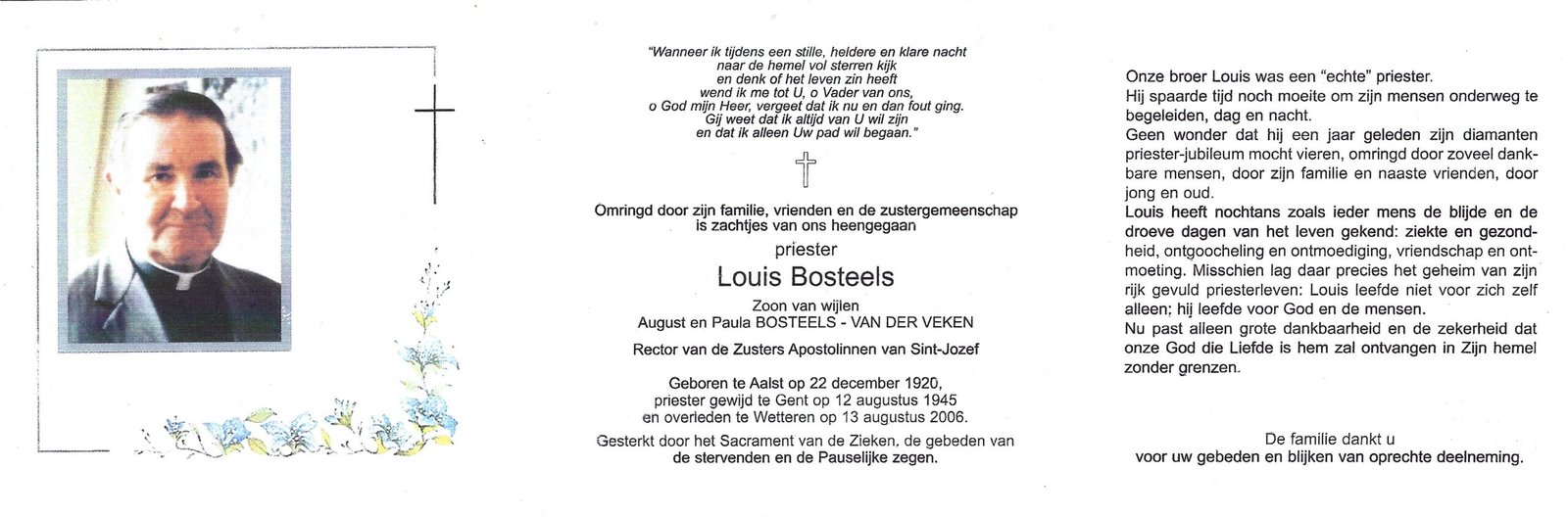 Bosteels Louis, Onderpastoor HaaltertAalst22/12/1920Wetteren13/08/2006