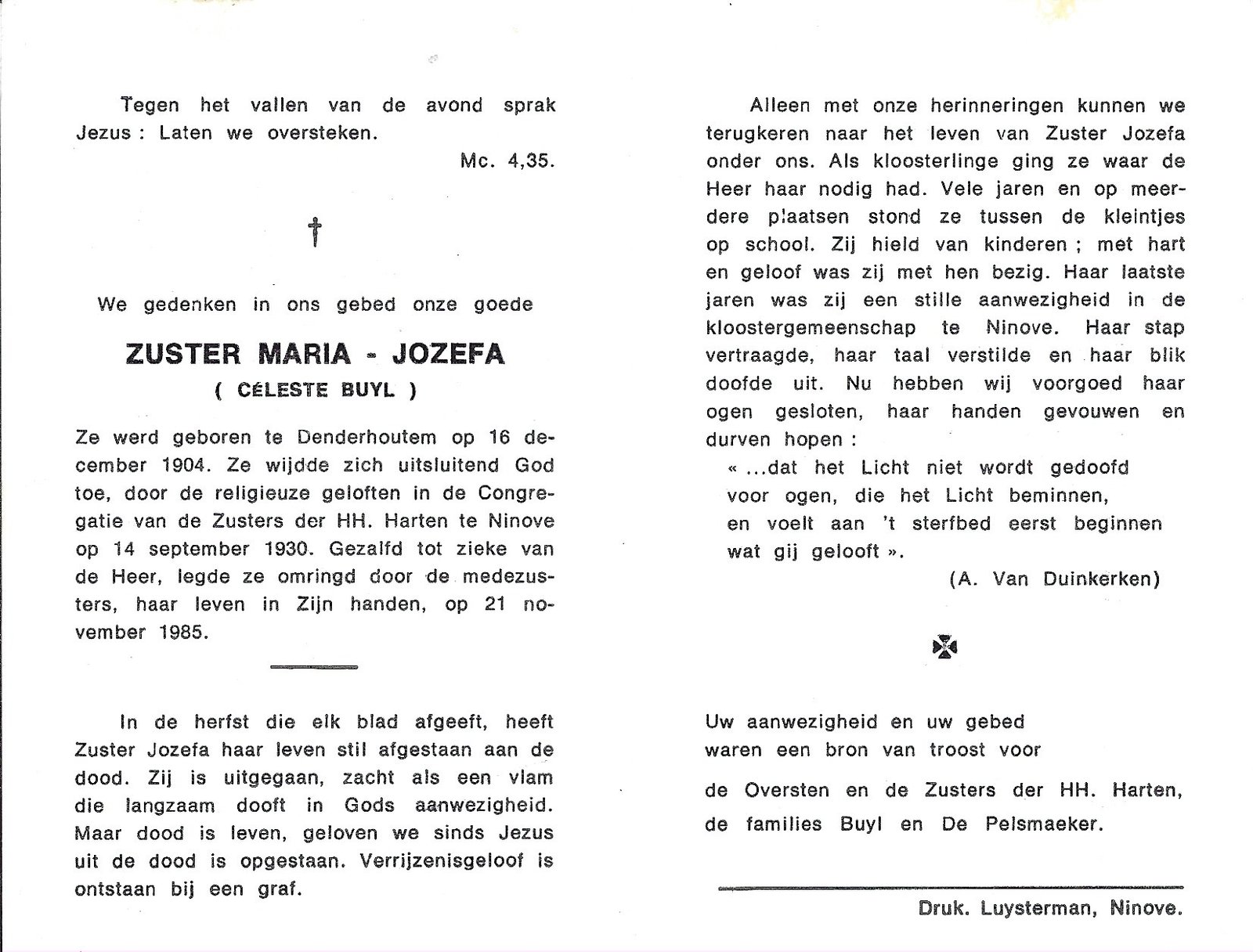 Buyl Celeste, Zuster Maria-JozefaDenderhoutem16/12/1904Ninove21/11/1985