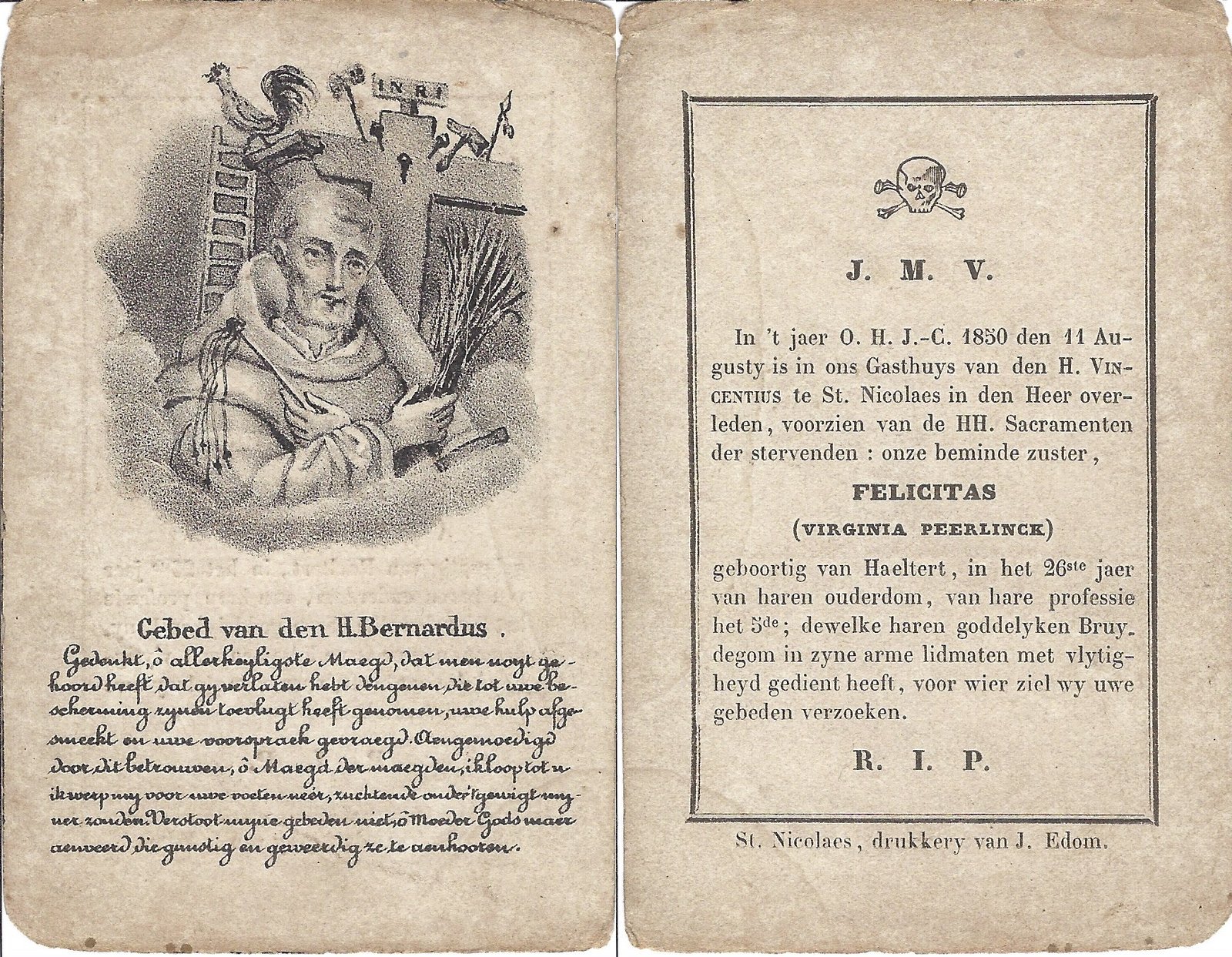 Peerlinck Virginia, Zuster FelicitasHaaltert22/02/1825Sint-Niklaas11/08/1850